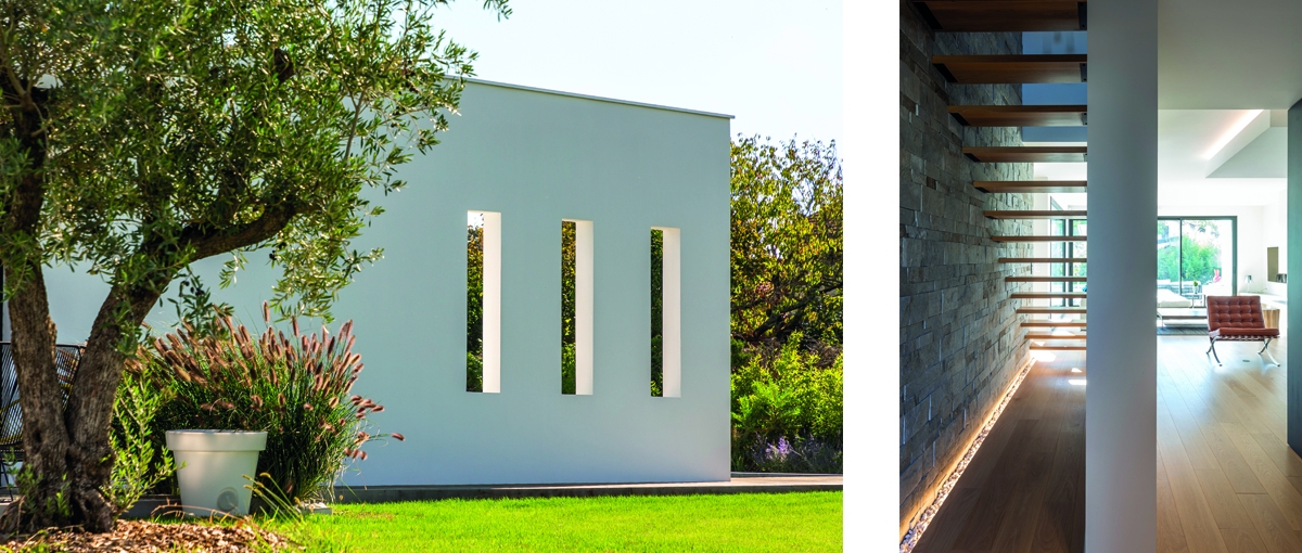 L’entrée se fait par un mur directeur recouvert d’un parement en pierre extérieur et intérieur. Son effet massif est accentué par la traversée visuelle qui longe ce mur de part en part jusqu’à la piscine, l’escalier en bois sans contremarche qui vient prendre appui et l’éclairage léché qui arrive du sol. Cet axe est aussi traversé par un axe perpendiculaire, du petit salon Ouest jusqu’à la chambre principale.