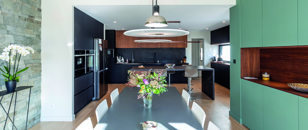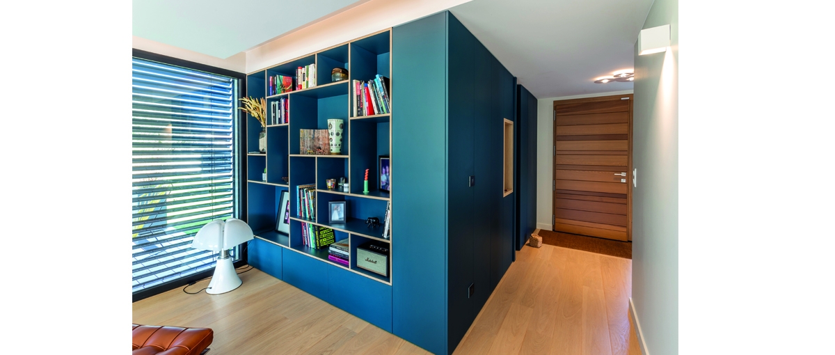 Avec une ambiance scandinave épurée, l’ensemble du mobilier est travaillé pour s’intégrer dans chaque pièce en termes d’usages imbriqués, d’usages parfois cachés, de couleurs, de matières et de décoration. Les différents espaces extérieurs créés ont chacun un degré d’intimité qui leur est propre.