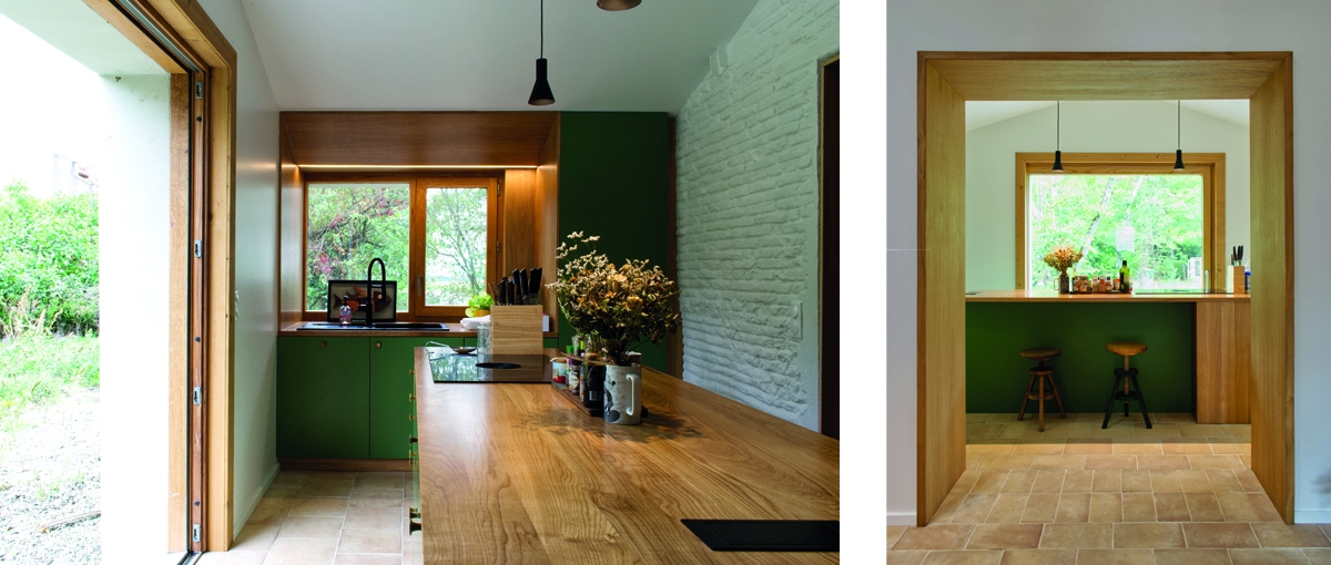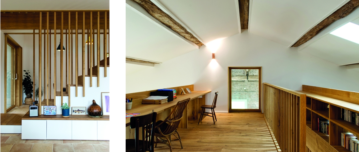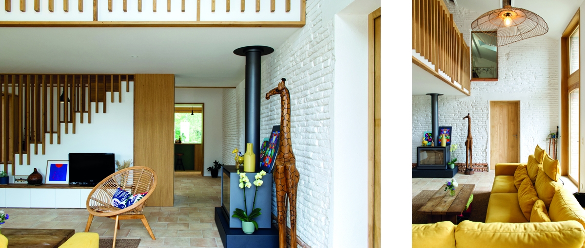 Les volumes de la maison ont été complètement redéfi nis à l’intérieur de la bâtisse. Le séjour et la salle à manger bénéficient chacun d’une double hauteur de part et d’autre d’une mezzanine centrale, dessinée comme un meuble en bois massif, support d’usages. L’étage est dédié aux enfants et offre une série de points de vue sur le niveau bas et sur la grange. La cuisine se loge dans une annexe attenante à la salle à manger et s’ouvre largement sur le potager.