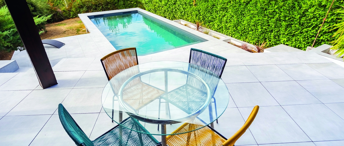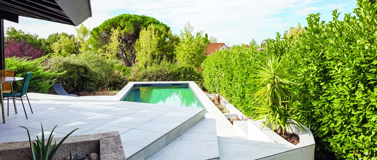 Les espaces extérieurs ont été revisités pour offrir une large terrasse et une piscine adaptée au dénivelé du terrain et à la vivacité de l’architecture.