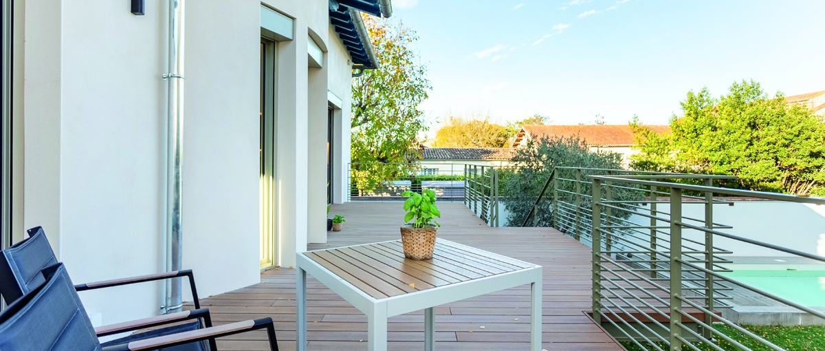 Les fenêtres existantes côté jardin du niveau principal ont été agrandies et transformées en baies vitrées, les espaces de vie ont été prolongés par une terrasse sur pilotis métalliques.