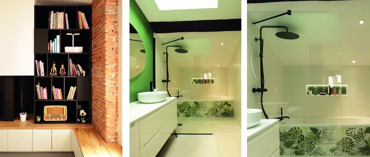 Un meuble avec rangements en partie basse détourne les allèges de fenêtres trop basses en une banquette et se prolonge dans le coin salon. Il accompagne le mur de briques foraines restauré. Une bibliothèque sur mesure épouse et joue avec les conduits de fumées de l’immeuble.