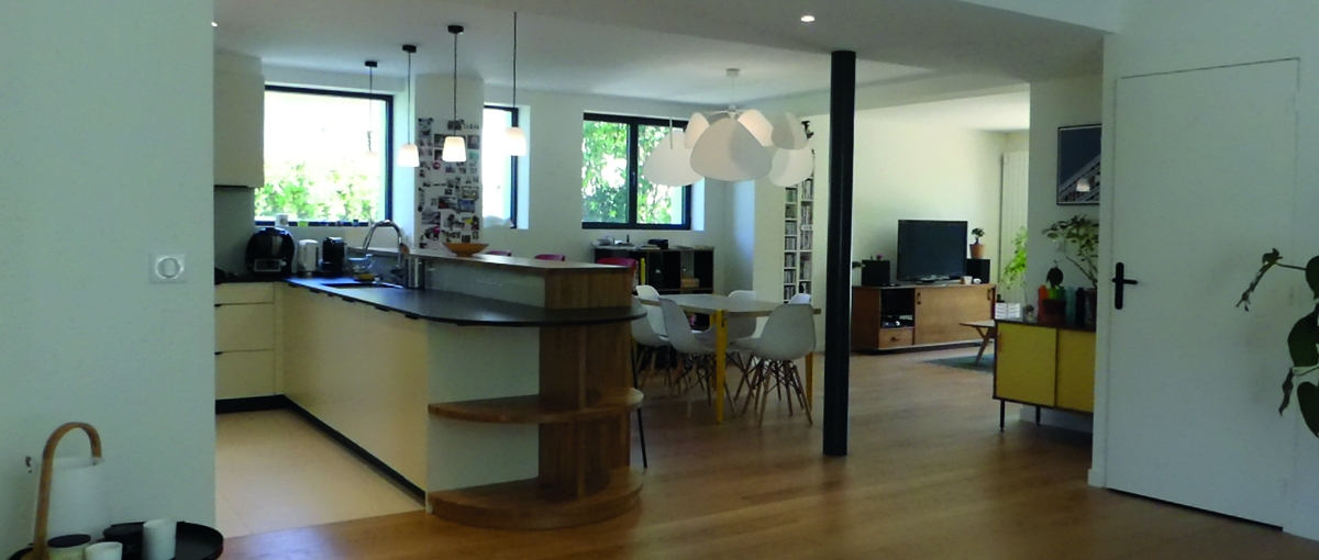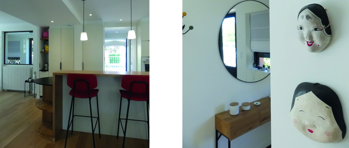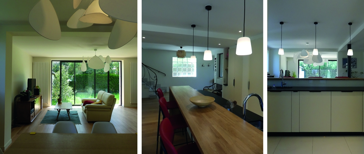 La cuisine est sur mesure : les plateaux sont en granit noir et en chêne massif, les lignes simples et les façades des mobiliers reçoivent une laque mate. Les perspectives intérieures et les vues créées tous azimuts participent à mettre en lien l’ensemble du niveau avec l’extérieur. Les lustres soulignent les lignes créées soit par le mobilier sur mesure, soit par les perspectives. Les menuiseries extérieures sont à rupture de pont thermique, les façades, isolées par l’extérieur, ont pour finition un enduit minéral clair.