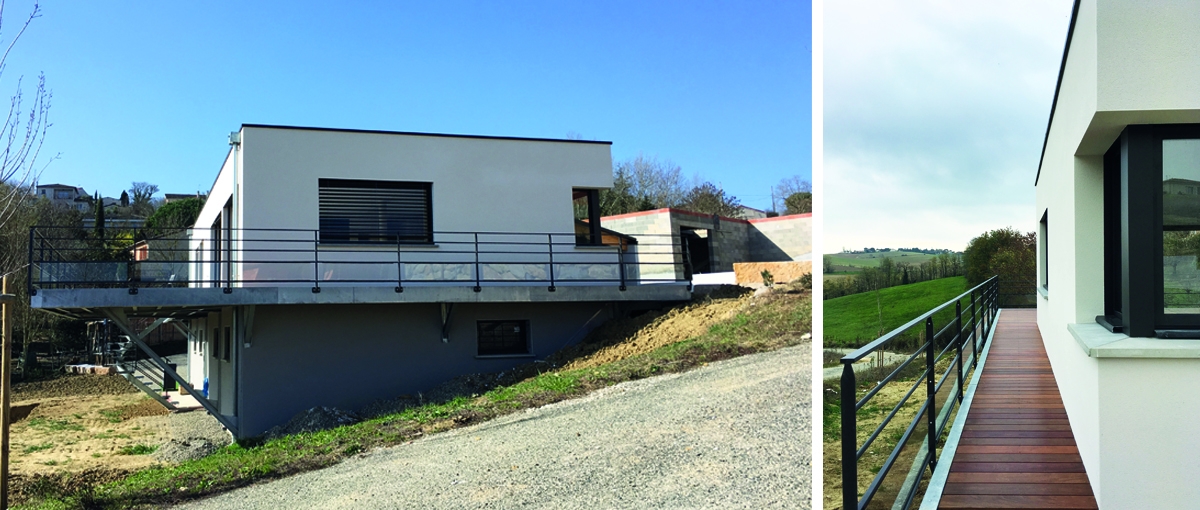 Une maison individuelle implantée sur un terrain en forte déclivité vers le Sud.