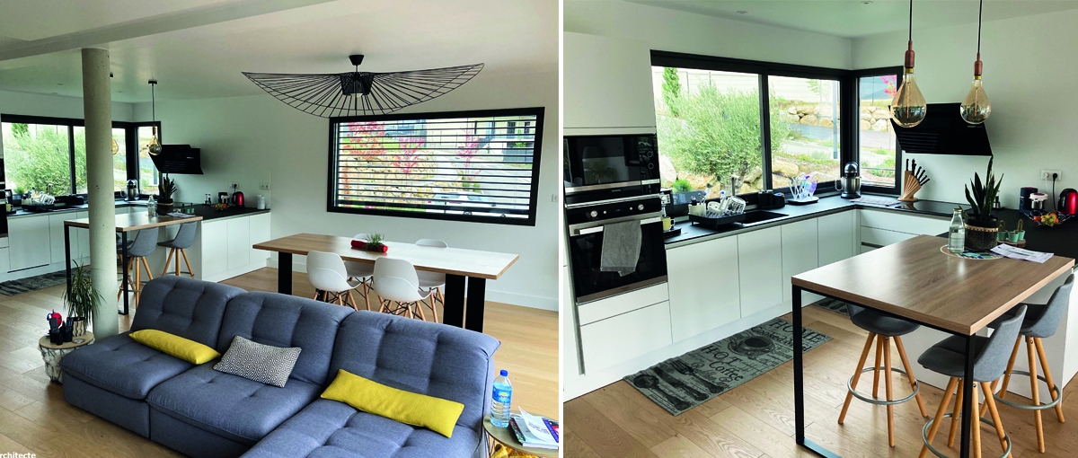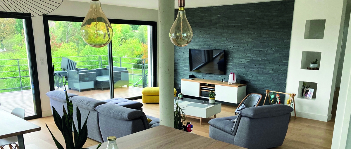 La surface habitable est aménagée de façon à privilégier un espace de vie familial de plain-pied ouvert sur une vaste terrasse couverte en bois en surplomb du terrain qui permet de profi ter d’une vue dégagée sur la vallée.