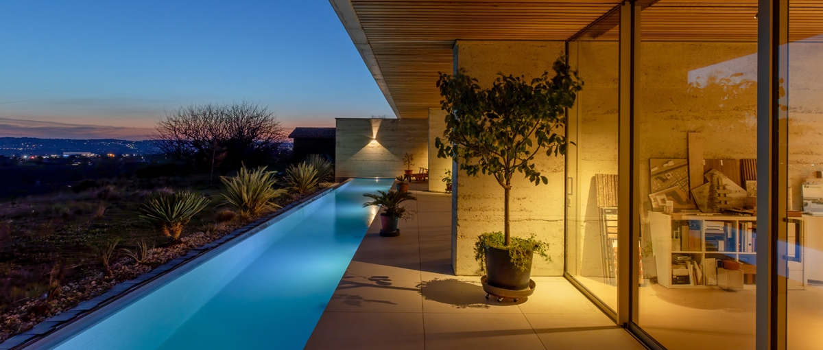 Le projet de construction de cette maison individuelle bioclimatique de plain-pied s’inscrit dans la pente et vient proposer des cadrages sur le paysage lointain de la chaîne des Pyrénées, mais aussi une protection aux vents dominants. Développée selon les principes bioclimatiques, low-tech, mais aussi d’intégration au site, la maison se retrouve semi-enterrée dans la pente, ceci permettant d’optimiser son inertie malgré d’importantes ouvertures, mais aussi de constituer des jeux de terrasses.