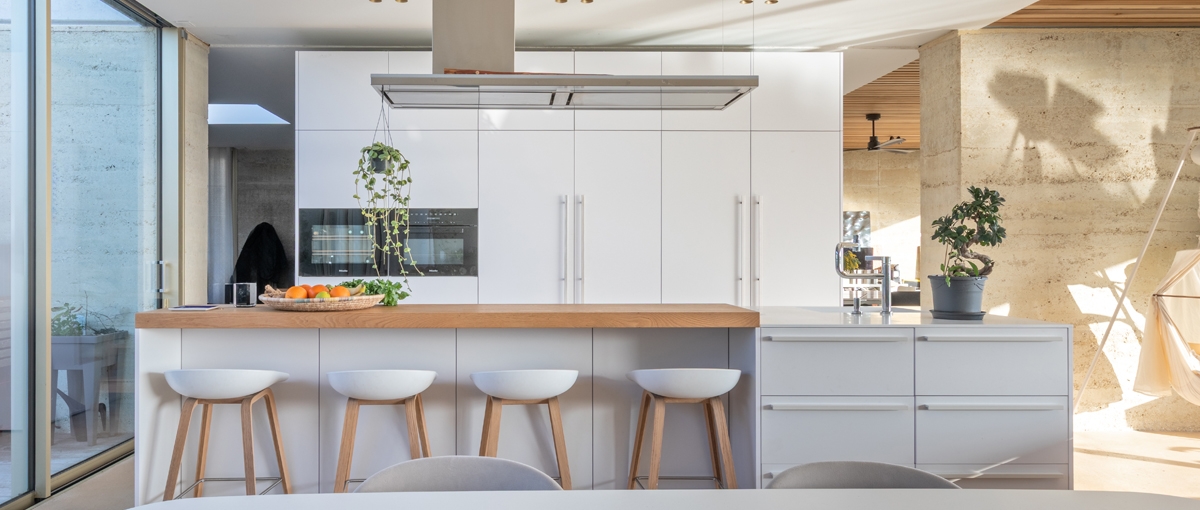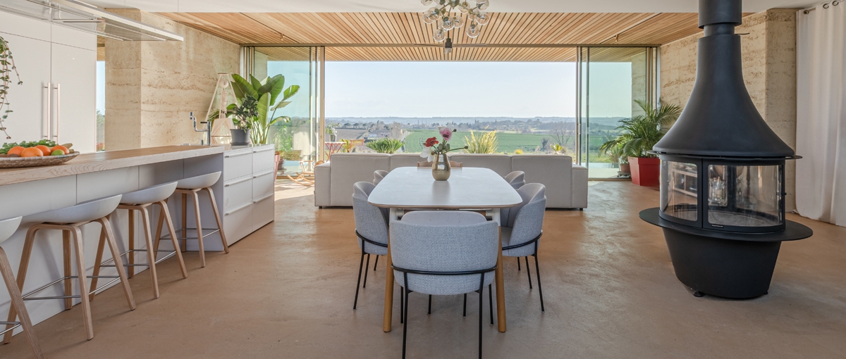 L’aménagement de la maison est simple. Les pièces à vivre orientées au sud sont protégées des rayons du soleil en été par une casquette, et ventilées naturellement au moyen d’un patio intérieur nord, véritable poumon de la maison. Toutes les pièces gravitent autour de la grande pièce à vivre centrale.