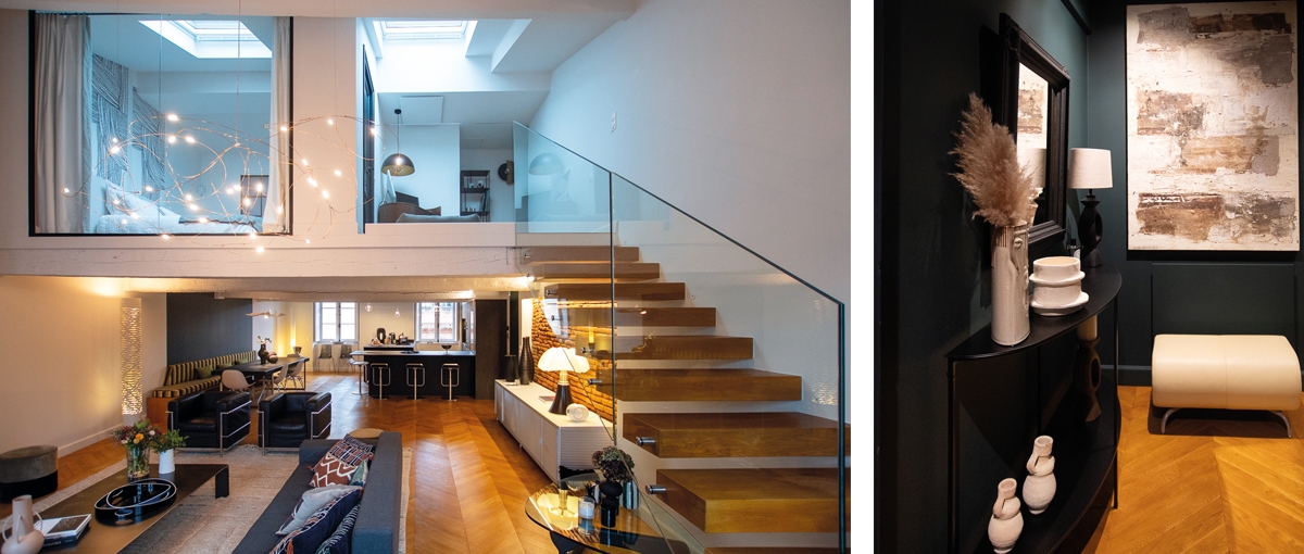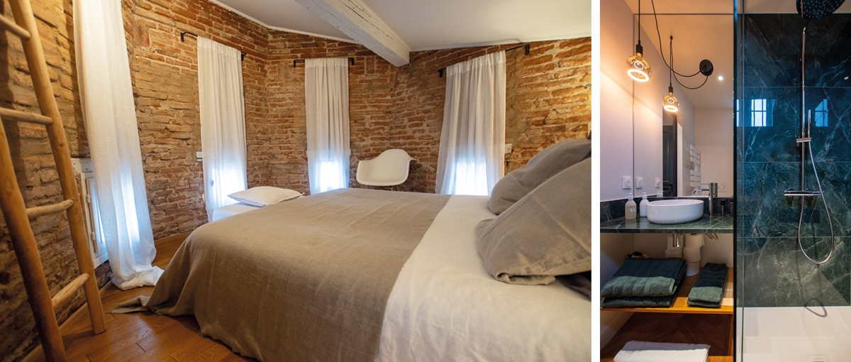 Le joyau s’agrandit par un triplex dévoilant un ensemble de réception atypique avec chambre au top d’une tour capitulaire. le lin sur toute sa hauteur couvre avec légèreté les briques brutes.