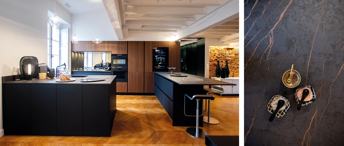 Ainsi, il invite à gagner la pièce à vivre comprenant la cuisine, le salon avec son mur de briques et la salle à manger, soulignée par un mur de couleur, comme un prolongement au couloir. La cuisine en bois latté, conçue comme un mobilier, aux plans en Dekton® veinés de nuances tabac, s’harmonise chaleureusement avec les meubles design.