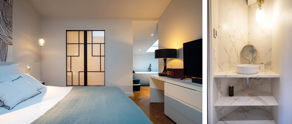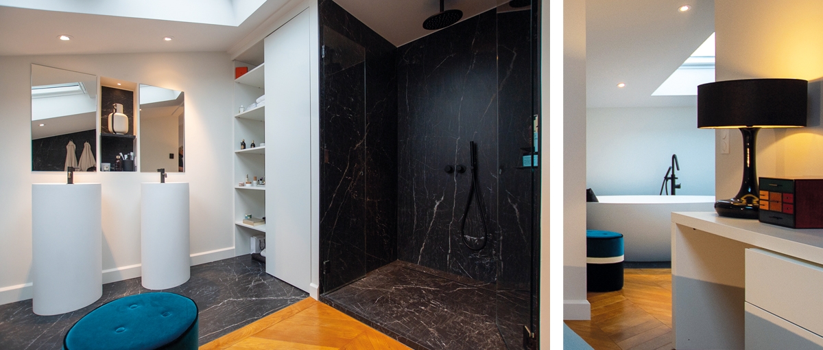 Les salles d’eau : une place au grands formats de Dekton®, mêlée au bois miel des sols en point de hongrie.