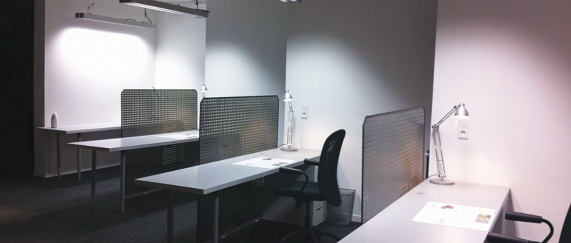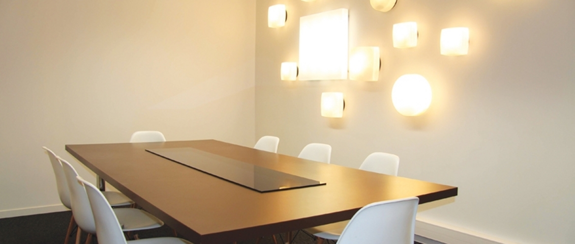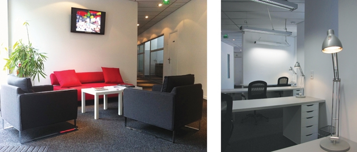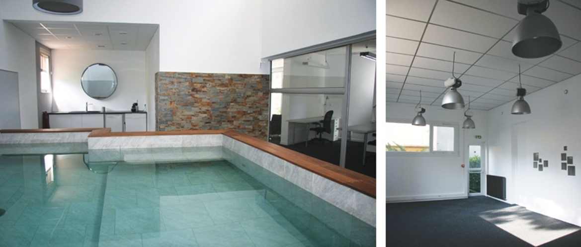 Ancien centre médical de 250 m², entièrement rénové et pensé en fonction de sa nouvelle activité, il a été reconverti en pépinière d’entreprises et a permis de mettre en commun des services, espaces et moyens pour les différentes sociétés qui occupent les lieux. Il s’agissait cependant de conserver au maximum l’esprit originel et le caractère du lieu. Ainsi, l’ancienne salle de gym est devenue un grand bureau de 40 m². La salle de consultation et l’accueil secrétariat forment deux petits bureaux fermés. Les anciennes cabines de soins constituent l’openspace (6 postes de travail). Quant au bassin de rééducation, il est le point central du projet, espace de détente et de convivialité, point de rencontre des différents locataires. Un esprit sobre et industriel : volumes blancs et sol foncé, eau et pierre. Un grand souci du détail et de la mémoire du lieu : les luminaires des années 70’s de l’ancien centre médical ont été conservés et constituent le « mur de lumière » de la salle de réunion, les boutons de commande de l’ancienne radio deviennent voyants lumineux d’occupation de la salle de réunion, la piscine, transformée en bassin d’agrément est devenue le point central des locaux.