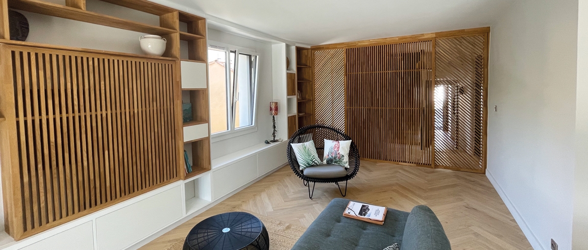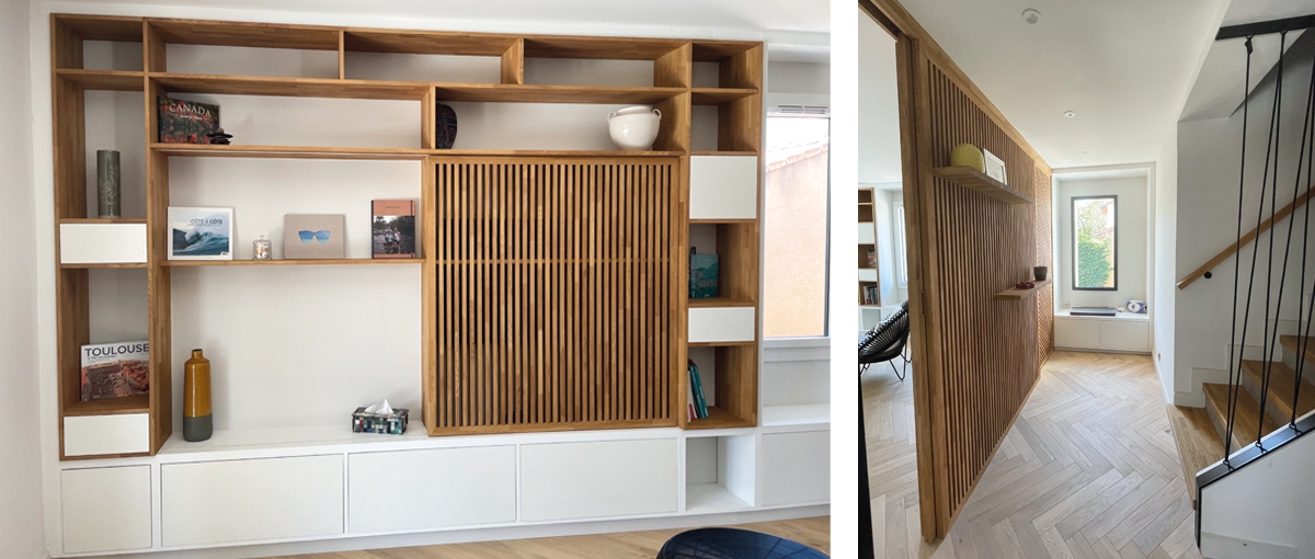 La bibliothèque s’intègre alors entièrement au mur du salon pour accueillir aussi bien les livres que la télévision. Cette dernière se cache parfois derrière un panneau coulissant en claustra bois. Ce séparatif rappelle celui situé entre salon et entrée qui permet de créer une intimité sans pour autant bloquer le regard ou la lumière.