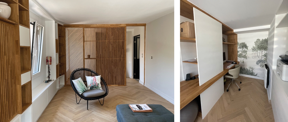 L' enjeux de cette rénovation : changer d’espace, retrouver un confort de vie et de travail, harmonie, fonctionnalité et rangement. Le tout par touches chirurgicales.