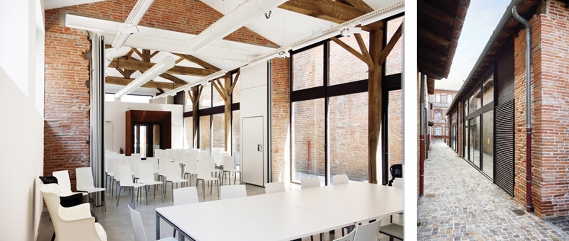 Le préau des anciennes écoles, au coeur historique du village, était laissé à l’abandon depuis longtemps. La mission était de restaurer ce bâtiment, de lui rendre son âme, de lui redonner vie et d’en faire un espace modulable mutualisant deux fonctions : une salle de réunion pour le Conseil Municipal et le lieu de cérémonie pour les mariages. En opposition à la force des épais murs, en opposition à cette matière rugueuse classique, aux joints marqués, à cette architecture classique du préau, rationnelle, rectangulaire, symétrique, l’intervention s’est voulue contemporaine grâce à sa forme origamique, libre et légère et au matériau utilisé, l’acier corten. Cette mission a également été étendue à la requalification de l’espace public, aux abords du bâtiment (sol en pavés, mobilier urbain,…) en harmonie avec la nouvelle image du Préau.