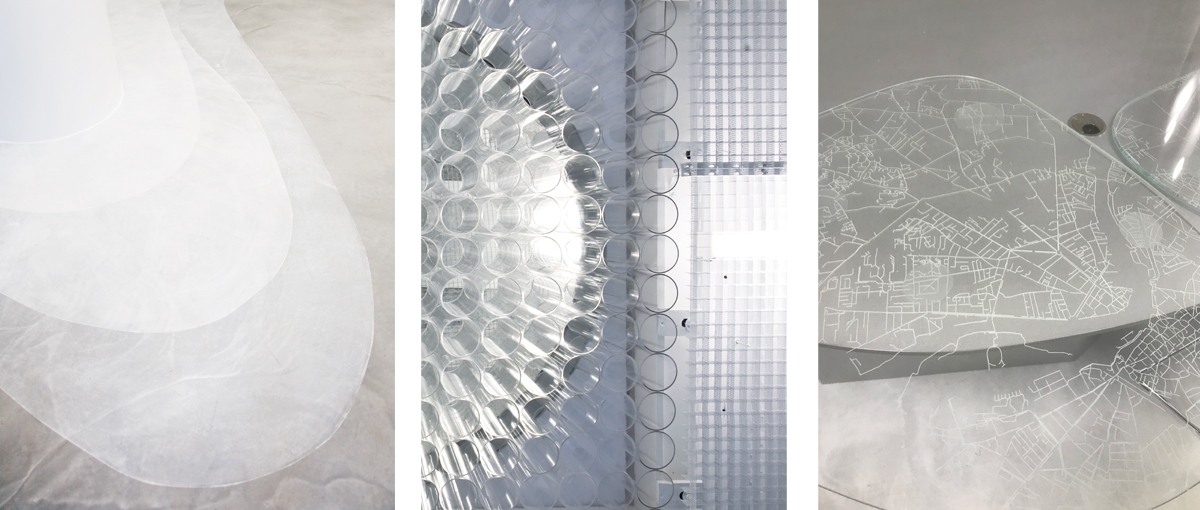 Toutes les composantes : espace matière lumière sont choisies, dessinées, implantées de manière à évoquer les processus de la transformation de l'eau, son traitement : pour exemple, un sol en béton parlant des ouvrages d’art liés à l’eau, un plafond en grille ajourée pour évoquer les systèmes de « dégrilleurs » enlevant une partie de la terre présente dans l’eau, les tubes en verre pour le traitement des ozoneurs...