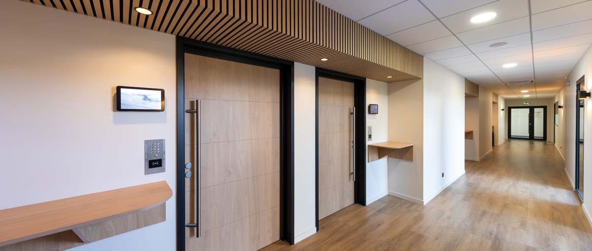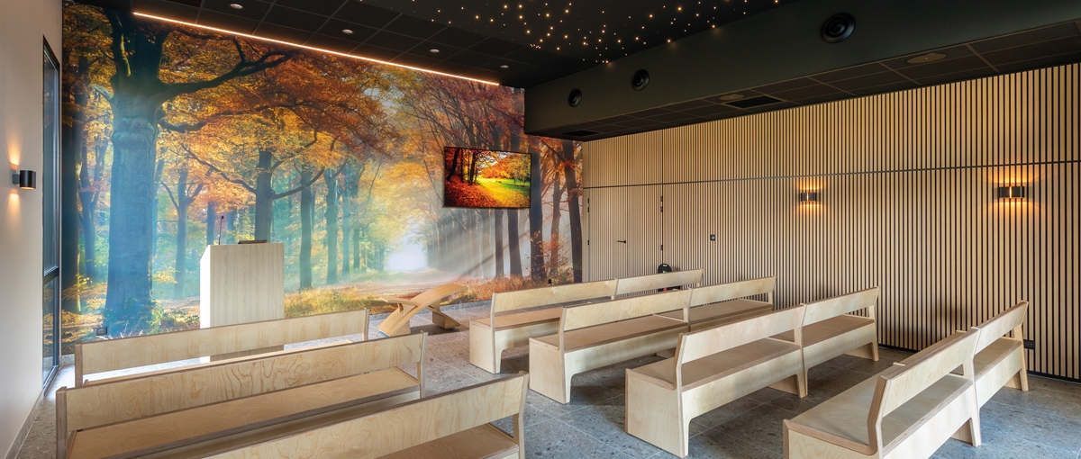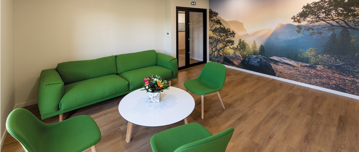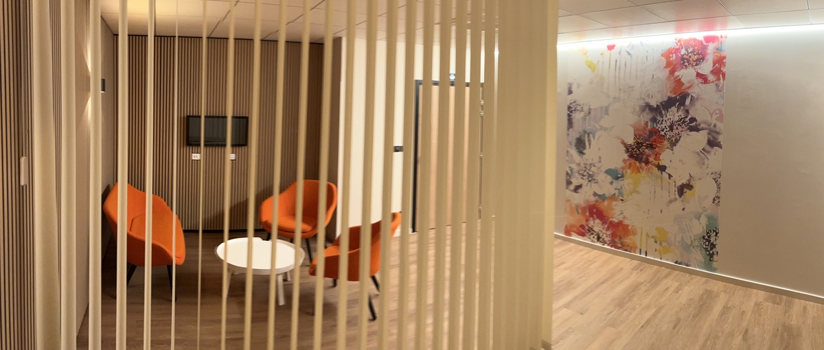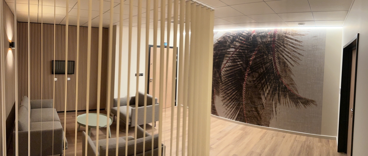 Ce lieu nous invite à l'évasion en contact avec le milieu naturel du patio et jardin et avec une salle équipée d'un plafond étoilé et une toile murale représentant un paysage d'automne. Un mur revêtu de panneaux acoustiques avec bardage bois et du mobilier bois viennent traiter l'acoustique tout en apportant une ambiance chaleureuse.