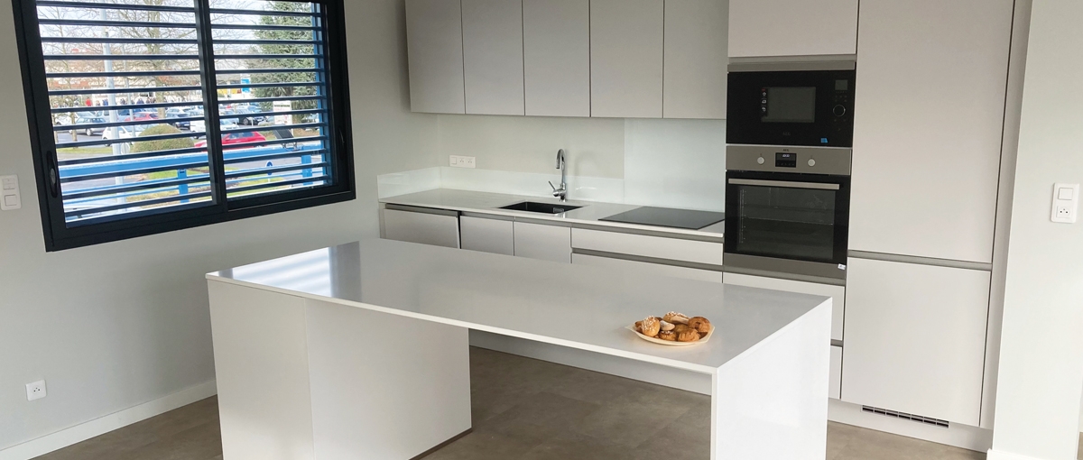 L’ensemble a été traité en toit plat, entièrement recouvert d’ITE permettant une volumétrie moderne et une uniformité de traitement des façades. Un écran métallique vient recouvrir la façade principale avec un rôle de signal et de brise-soleil.