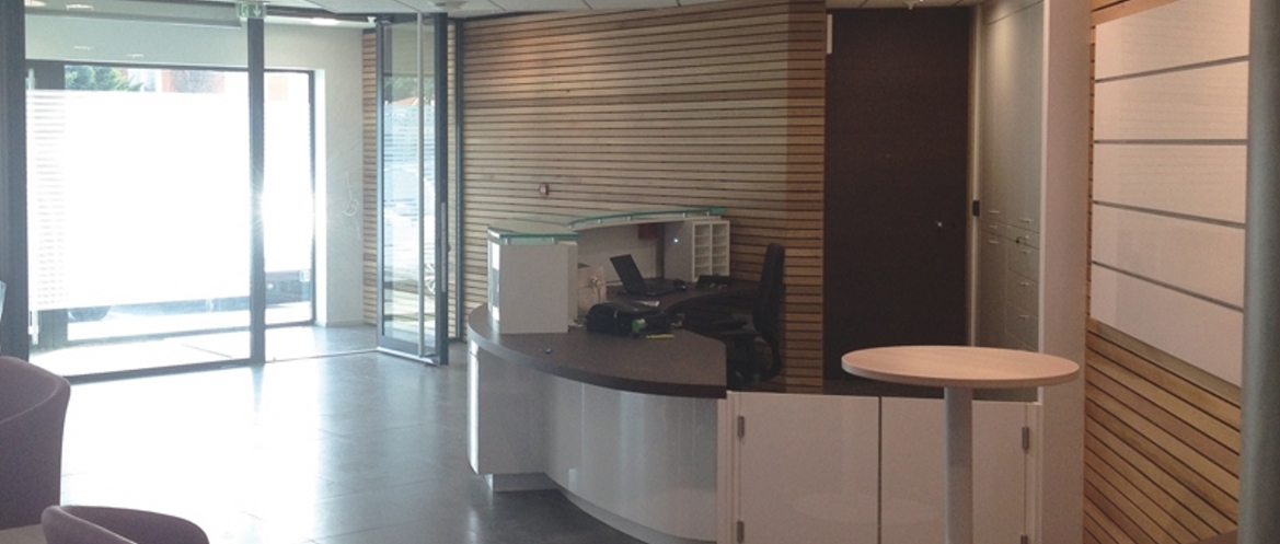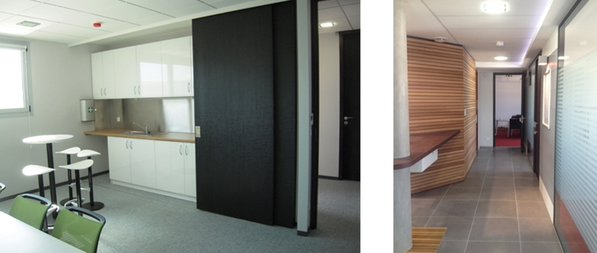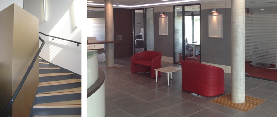 Pour ce projet, l’architecte a souhaité proposer quelque chose de résolument singulier. Une réalisation qui puisse combiner un environnement solennel avec des matériaux nobles, une ambiance plus chaleureuse. Ainsi, on retrouve un bois comme le red cedar ou encore des poignées de portes en plexiglas spécialement dessinées pour l’établissement. Pour les fermetures, les portes, disposent d’un ferme-porte intégré au gond et peuvent ainsi rester ouvertes facilement. Côté carrelage, l’architecte a réalisé un calepinage de carreaux gris sur les murs. Quant à la moquette, sur les tons corail, elle ajoute une touche de couleur à l’ensemble et offre ainsi une atmosphère agréable à vivre au quotidien, aussi bien pour les employés que pour les clients. Grâce au travail du cabinet Sirach-Viennois, et aussi au choix du mobilier, la réalisation s’offre une ambiance pérenne qui pourra, au gré de ses envies, recréer une nouvelle ambiance, sans changer la couleur des murs.