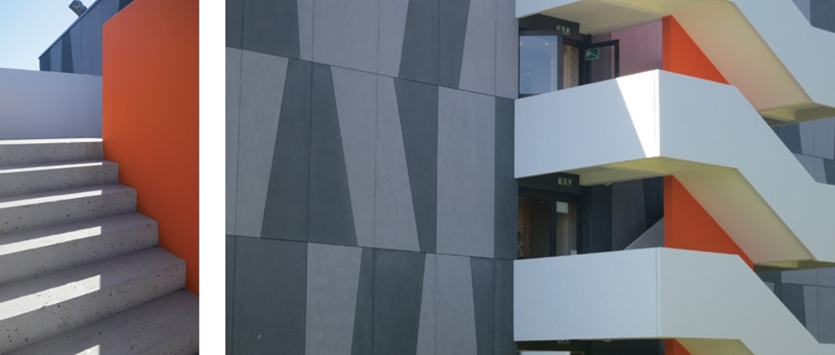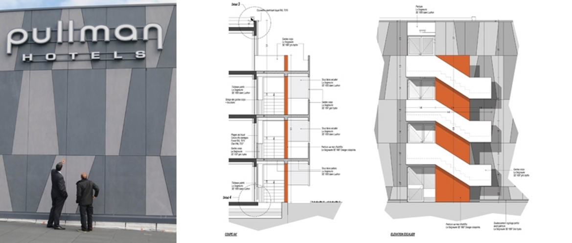 Comment redonner une nouvelle image à une façade désuète partiellement délabrée tout en respectant les codes véhiculés par une enseigne hôtelière de prestige ? Pour corser un peu la problématique, seuls les deux pignons anciennement recouverts de briquette seront concernés. C’est un véritable exercice d’école auquel l’Atelier d’Architecture Christophe Aubailly a été confronté. Pour y répondre l’agence s’est appuyée sur les matériaux et couleurs qui composent le bâtiment : du béton et des teintes neutres blanc, gris clair et gris foncé qui sont aussi les couleurs de la marque. Le vocabulaire se veut simple : des plaques de bardage fibrociment soigneusement calepinées, une mise en scène sobre et efficace des composants structurels, le mur d’échiffre et l’escalier de secours se distinguent par leur graphisme pur et révélés par un choix de couleur contrasté et harmonieux. Une réalisation fidèle et réussie grâce aux entreprises appliquées dans le respect minutieux du tracé : exercice concluant !