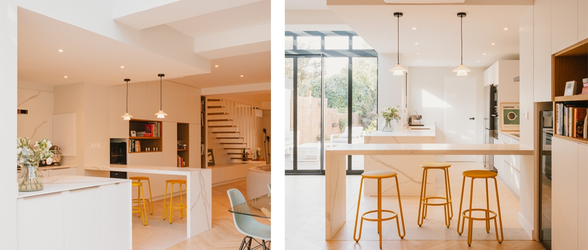 Ainsi, le rez-de-chaussée reçoit la généreuse pièce à vivre avec sa cuisine ouverte qui se prolonge par une véranda sur l’écrin de verdure du jardin.