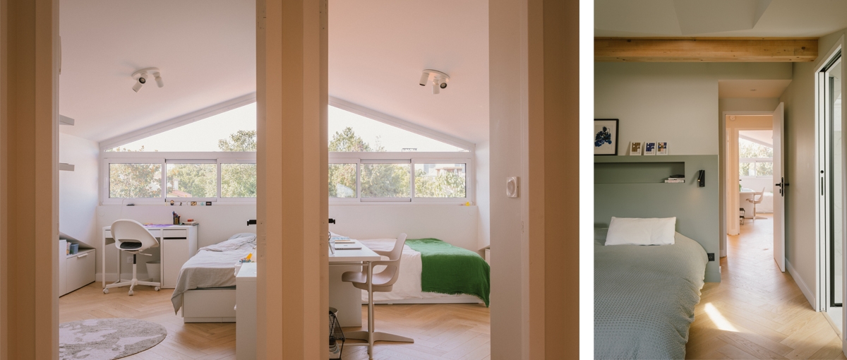 On accède ensuite par un escalier léger et transparent aux trois chambres de l’étage.