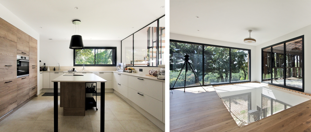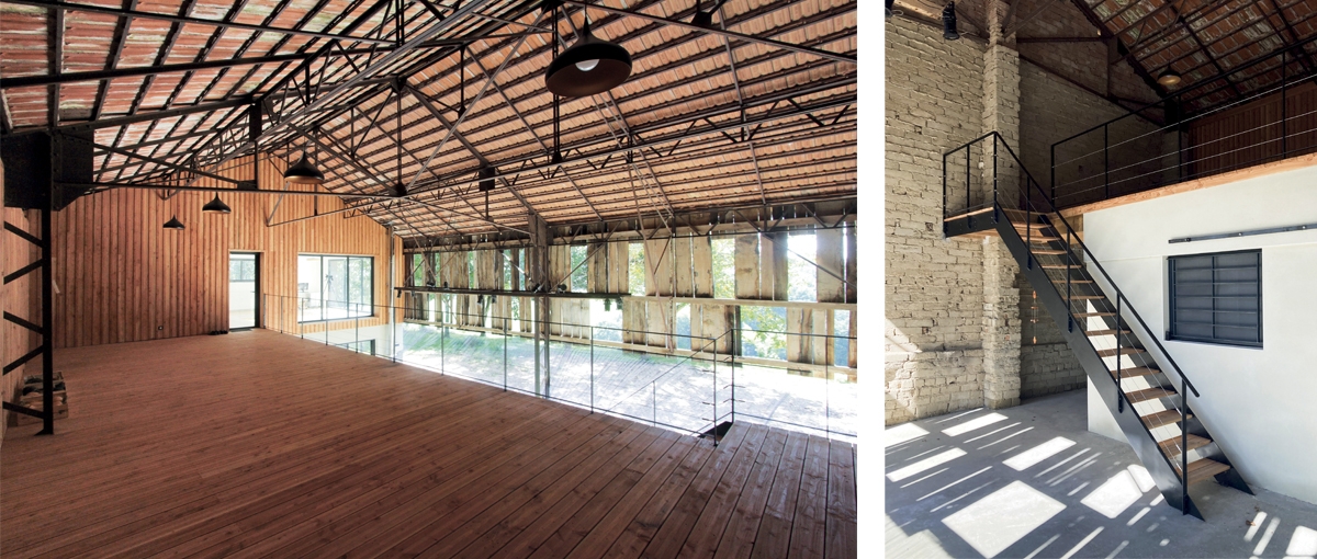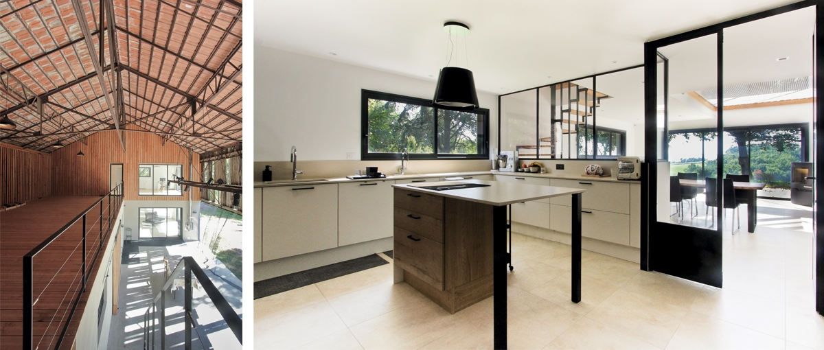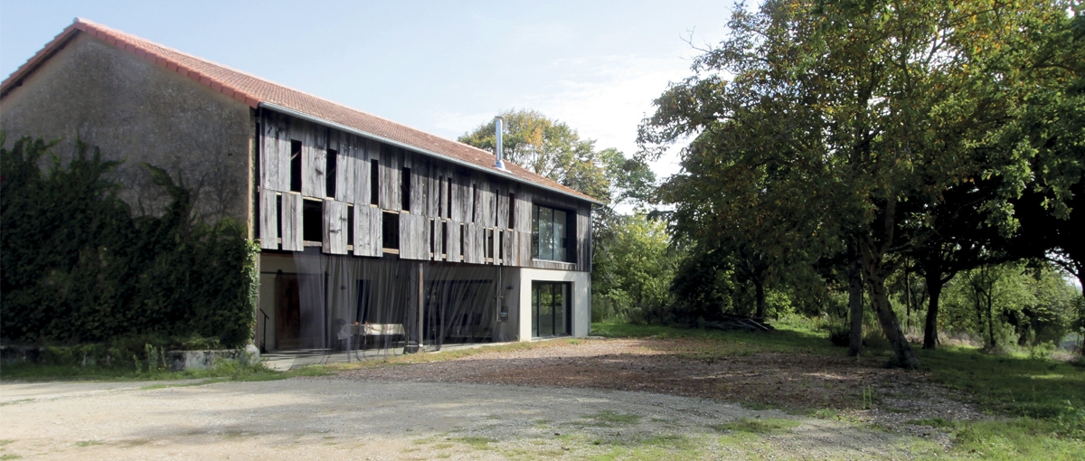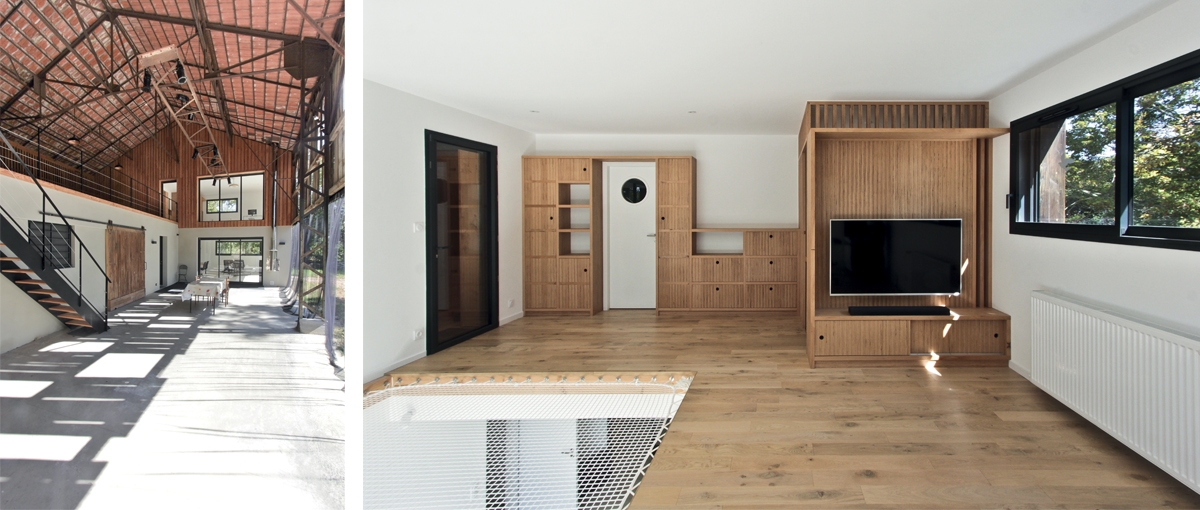 Dès ma première visite j’ai été séduit par ce hangar qui présentait tous les ingrédients pour créer un lieu de vie de grande qualité : emplacement sur le site, orientation, volumes, vues, cachet des matériaux déjà patinés... Plutôt que de construire une maison neuve, j’ai donc proposé aux propriétaires de la « glisser » sous ce hangar. Elle occupe la travée est et le reste du hangar permet l’aménagement d’un garage double, d’un cellier, d’une cuisine d´été, de rangements, d’un " labo miel " et surtout de deux généreuses terrasses couvertes. Toutes les pièces profitent de la vue directe sur les arbres et du soleil matinal filtré par le feuillage en été. Le séjour et le bureau en mezzanine sont également ouverts sur le sud et la vue lointaine sur la chaîne des Pyrénées, ainsi que sur les terrasses à l’ouest. Le choix des menuiseries aluminium et leurs dimensions ne bouleverse pas l’aspect du hangar mais lui apporte une subtile touche contemporaine. Le bardage existant, ajouré suivant un rythme « aléatoire » produit des jeux d’ombres et de lumières qui animent les terrasses tout au long de la journée. Le projet est également l’occasion de mettre en oeuvre une démarche de réemploi.
