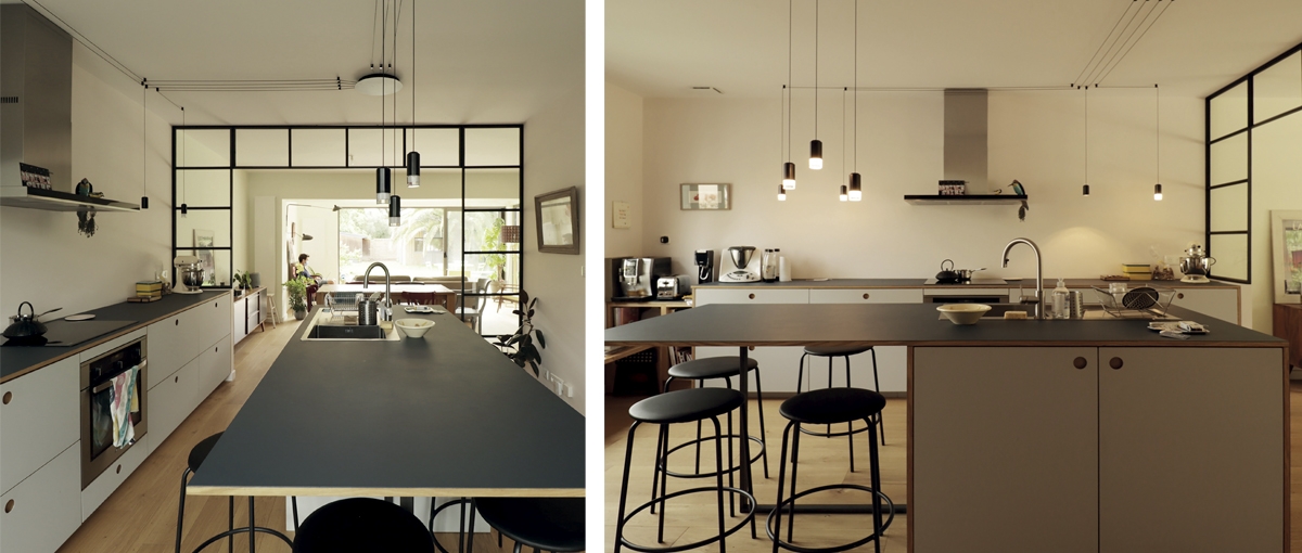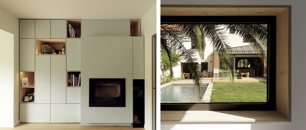 Le projet a permis de repenser ces espaces : reconstruction du volume de l'extension avec isolation des murs et du toit, réaménagement de la pièce de vie avec déplacement de la cuisine, ajout d'une cheminée avec son meuble sur mesure ; dans le jardin, aménagement de la dépendance en chambre d'amis et ajout d'une piscine avec terrasse.
