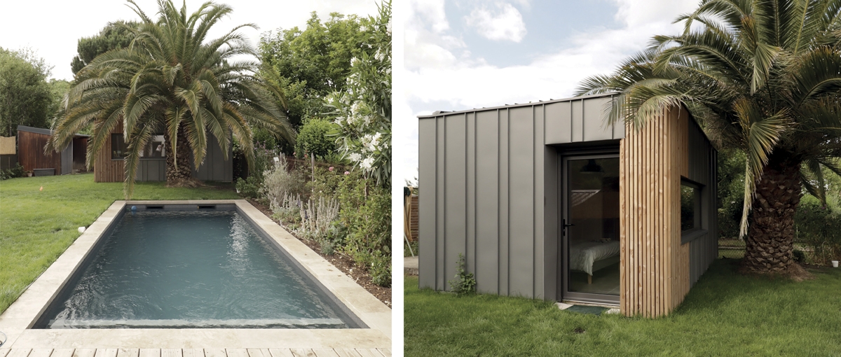 Les volumes en zinc et bois se regardent et se répondent. La réduction de l'emprise de la dépendance permet de profiter d'une belle perspective sur le jardin.