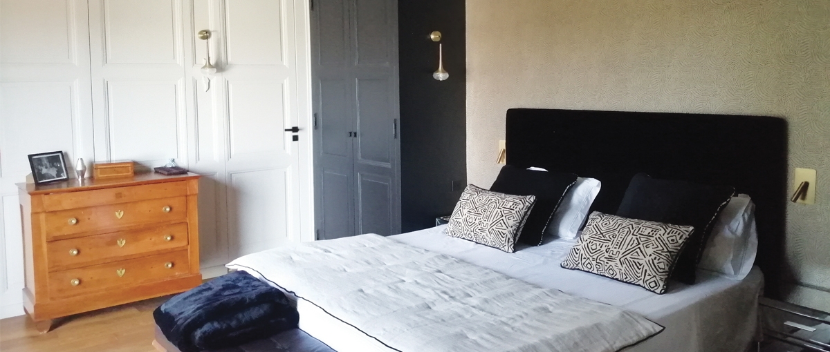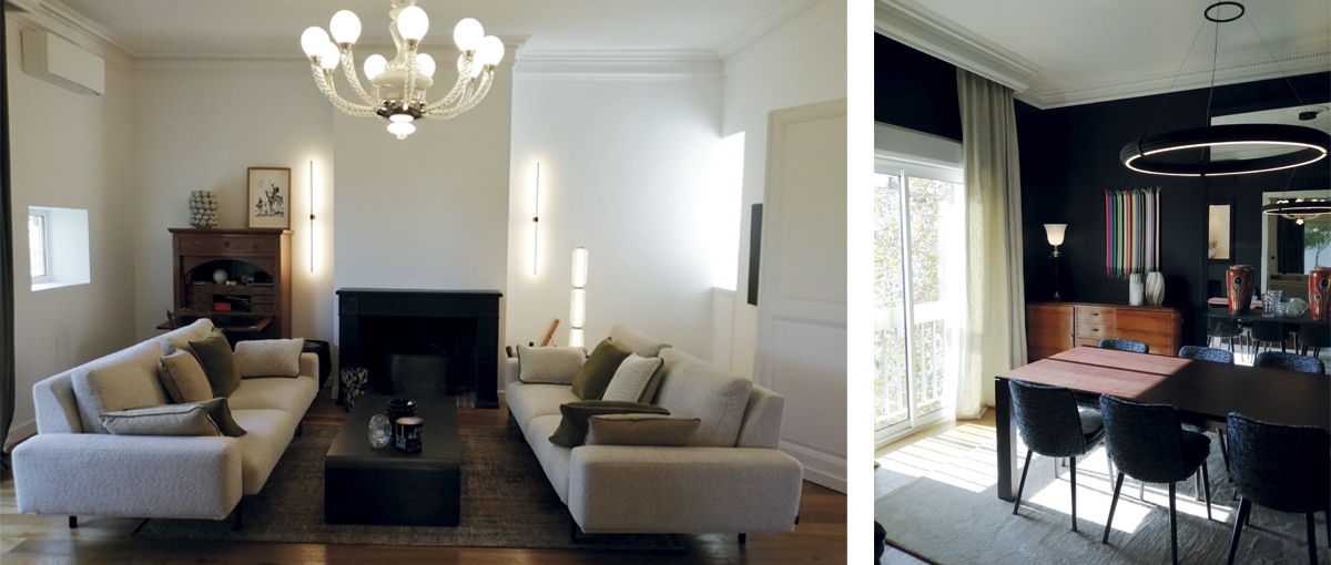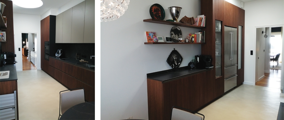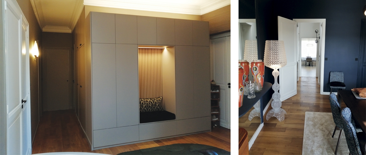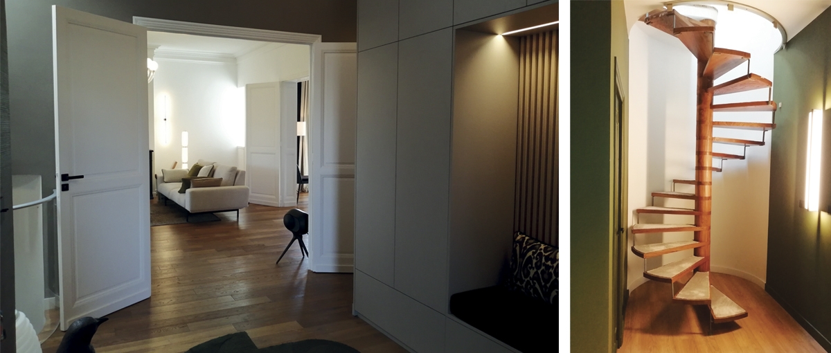 Cet appartement duplex est remarquable par ses grands volumes et sa luminosité, accentuée par des puits de jour dans plusieurs pièces. Le maître d’ouvrage nous a contacté pour la conception de la cuisine et d’un meuble dans l’entrée. Nous avons voulu une cuisine fonctionnelle et chaleureuse, avec son espace repas convivial. Avec l’équipe de Marc Da Silva, nous avons choisi un mélange de noyer et de laqué grège pour les façades et du Dekton pour les plans de travail et le plateau de la table sur son pied tulipe. Ces matériaux ont été prolongés dans l’avant-cuisine faisant la liaison avec la salle à manger. Le grand espace de l’entrée nous a permis de faire réaliser par i-trä Agencement, un meuble sur mesure intégrant penderie, tiroirs et également une assise confortable. Nous avons voulu un éclairage spécifique permettant d’accentuer la chaleur du bois. Très vite, nous avons accompagné le maître d’ouvrage pour la rénovation des salles de bains, mais aussi pour les choix des peintures, papiers peints, sols et des rideaux dans toutes les pièces de l’appartement, ainsi que sur le choix des mobiliers et luminaires complémentaires.