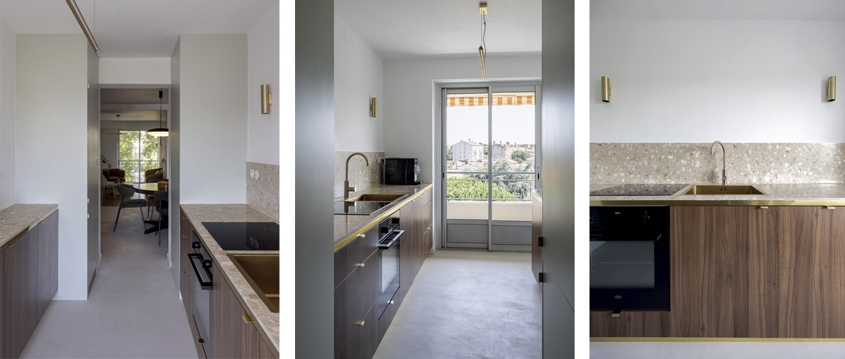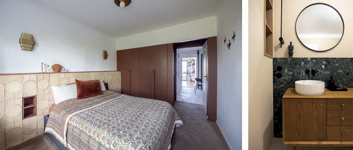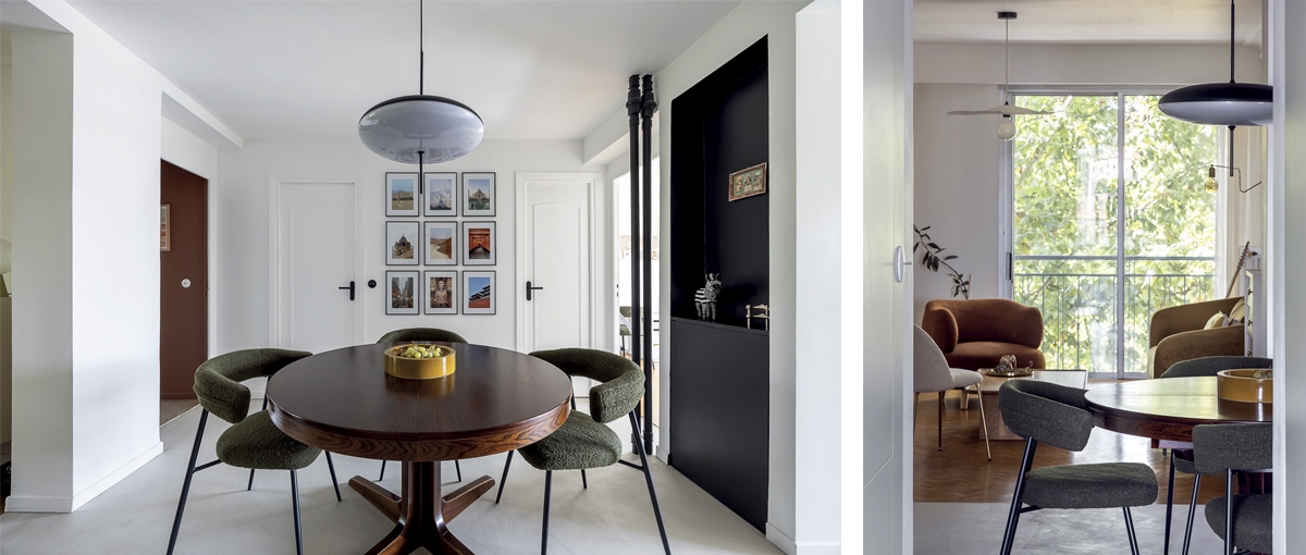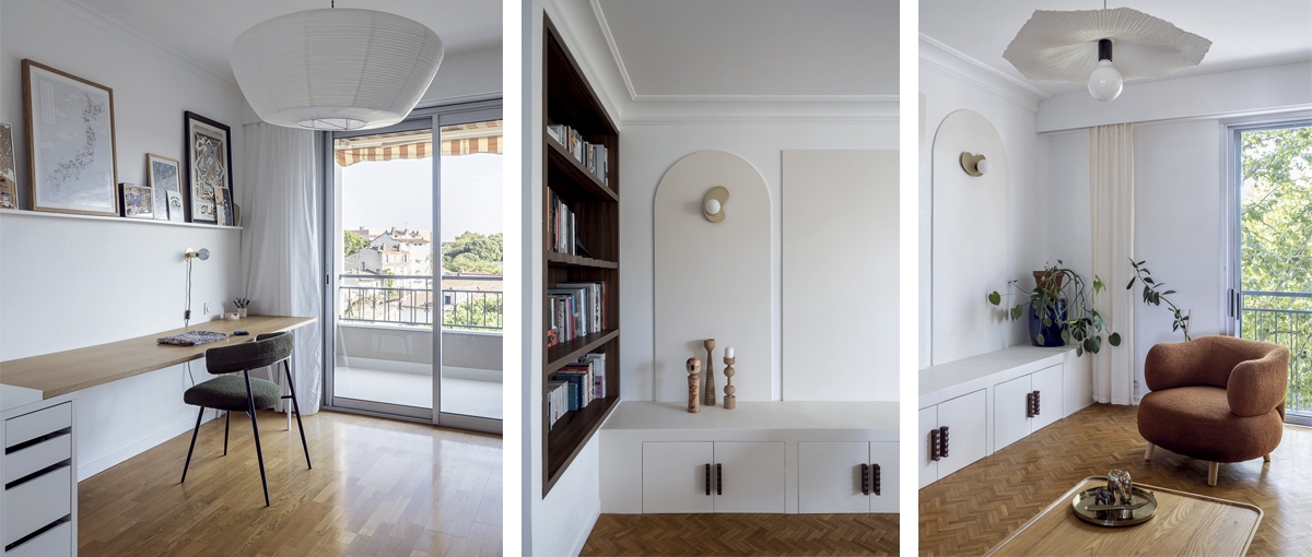 Ce projet de rénovation d’un appartement des années 70 se concentre sur la mise en lumière de la salle à manger comme pièce maîtresse. En ouvrant l'ancienne entrée et en réinventant le couloir de service, nous avons redonné à cet espace un vrai rôle central, baignée par la lumière qui traverse l'appartement du nord au sud. Située au centre de l’appartement, la salle à manger redirige désormais vers toutes les autres pièces, devenant le coeur de la vie quotidienne. L’appartement se raconte à travers des détails soigneusement pensés, où les lignes s’adoucissent, apportant une signature unique et chaleureuse à cet intérieur. Les poignées en bois façonnées avec soin se marient avec la bibliothèque « vagues », tandis que la faïence en terre cuite ornant la tête de lit évoque des paysages lointains. Chaque pièce est un monde en soi, un écrin où les matières et les couleurs s'entrelacent comme des souvenirs de voyage. La terre cuite nous transporte vers le sud, le noyer rappelle les essences du Japon et les moulures rappellent l’artisanat indien. Dans cet appartement, la couleur est pleinement assumée, à l'image de la cuisine et de ses tons « nougat/pistache ». Ce projet incarne une nouvelle lecture de l’espace, où chaque détail reflète une approche personnelle et raffinée.
