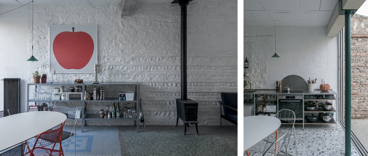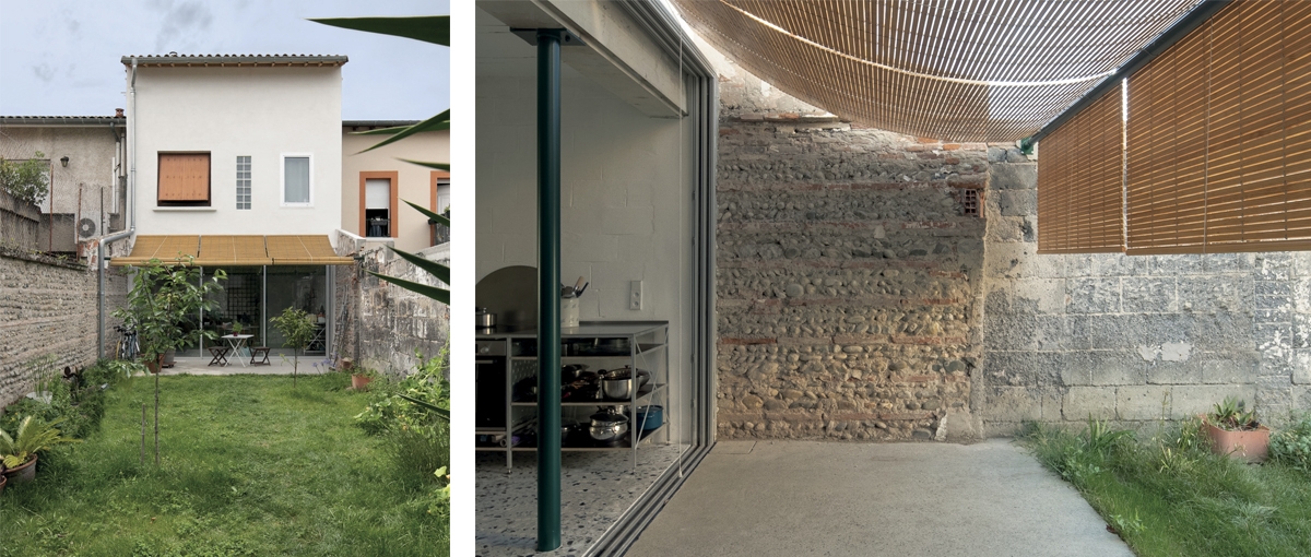 Le projet porte sur la rénovation d’une maison individuelle à Toulouse. Bien que datée et quelque peu vétuste, la maison préexistante présente l’avantage d’une parcelle de 5 mètres de large, facilitant le décloisonnement grâce à une structure en poutres-planchers hourdis. Au rez-de-chaussée, le garage est supprimé et la véranda et son cellier sont démolis, agrandissant ainsi le jardin. Une large baie vitrée coulissante, orientée à l’est, améliore la connexion entre le séjour et le jardin, apportant plus de lumière à la pièce à vivre. Côté rue, une paroi en pavés de verre, positionnée en retrait, crée un sas extérieur pour vélos et conteneurs, tout en offrant une mise à distance de la rue. Les matériaux existants, de bonne qualité, sont réemployés autant que possible. Les sols du rez-de-chaussée sont conservés. Les emplacements des anciennes cloisons sont rebouchés au béton et l’ensemble est poli. Sur les murs et plafonds, les traces des cloisons sont laissées brutes, permettant de conserver la mémoire des modifications passées. Les carreaux de l’ancienne véranda sont nettoyés et réutilisés dans la salle de bain. Enfin, au dernier étage, la toiture est ré-isolée par l’extérieur, des ouvertures sont créées et l’espace est laissé libre pour permettre de futures évolutions.