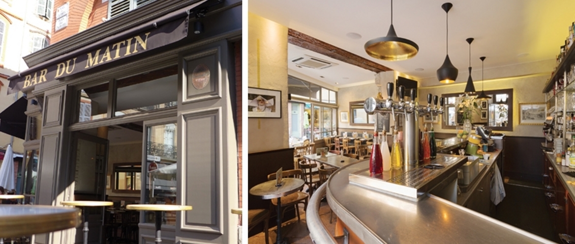 Le Bar du Matin est depuis 1821 le café incontournable de la place des Carmes à Toulouse. Véritable institution, aborder sa rénovation est un exercice délicat. La clientèle des habitués très attachée à « son bistrot « est réticente à toute idée de rénovation. Celle-ci était cependant devenue nécessaire, compte-tenu de la vétusté des ensembles menuisés de la rue des Filatiers et de la place des Carmes. Les façades ont été entièrement déposées et refaites dans l’esprit des devantures commerciales du 19ème siècle. La rénovation s’est poursuivie à l’intérieur avec de nouvelles couleurs, badigeon de chaux rehaussé de touches dorées. L’éclairage a été entièrement repensé avec une approche plus sophistiquée et intimiste. Des écrans ont fait discrètement leur apparition, le comptoir immuable est resté en place. Cette rénovation a permis de relooker en douceur le Bar du Matin qui traverse les époques et conserve son identité. Les habitués sont revenus…