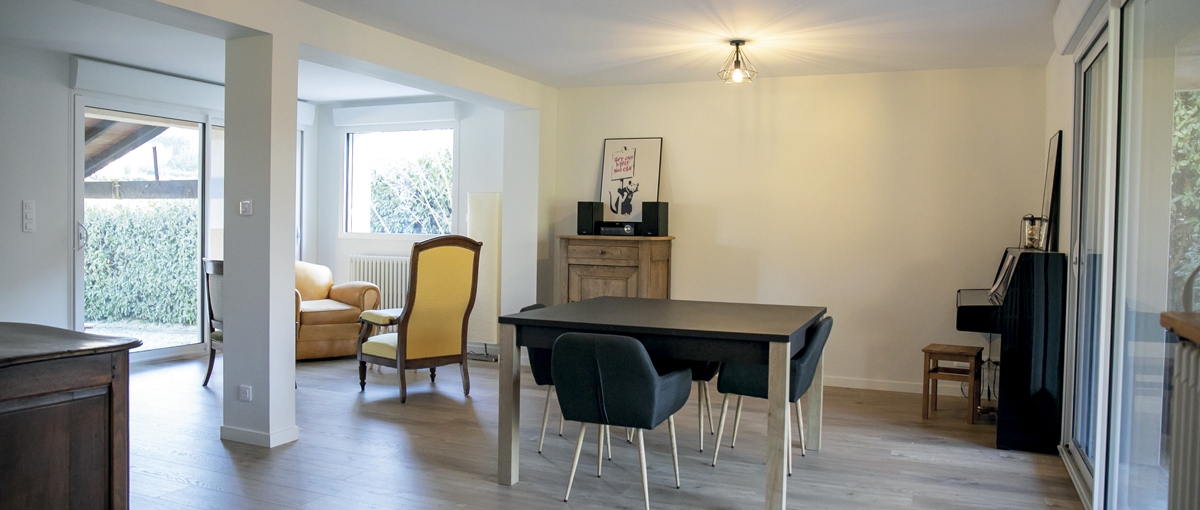 Des ouvertures en façades ont été modifiées et créées pour profiter du jardin. De larges ouvertures dans les murs de refend ont été réalisées au rez-de-chaussée pour aménager une grande pièce à vivre de 50 m2 et une entrée de plus de 6 m2.