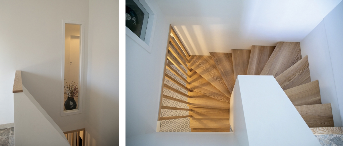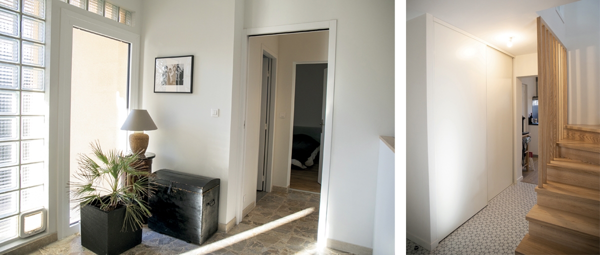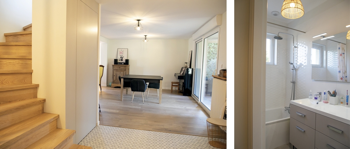 Le rez-de-chaussée a gagné en luminosité et en ouverture. L’escalier de service en béton et encloisonné a été remplacé par un escalier et un garde-corps en claustras de bois aéré et lumineux. La circulation entre la pièce à vivre au rez-de-chaussée et les chambres à l’étage, centrale, est ainsi plus fluide. Les salles de bains à l’étage ont été entièrement refaites.
