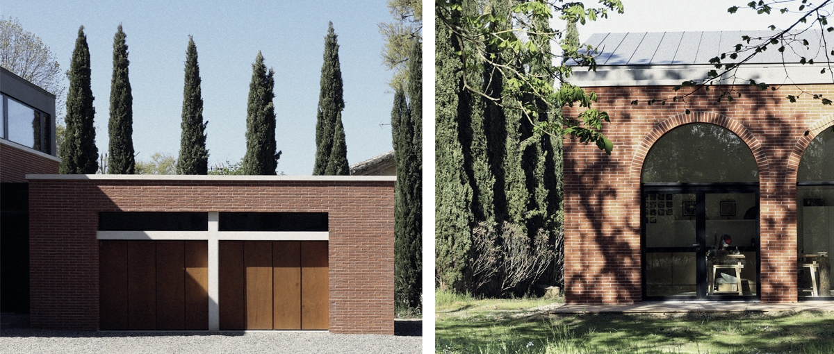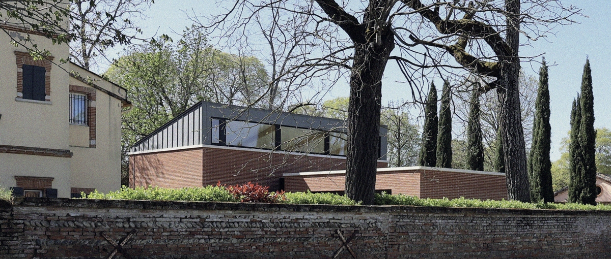 À la lisière d'un parc boisé protégé, l'atelier de mosaïque doit relever le défi de continuer l'histoire d'un patrimoine bâti et paysager remarquable. Pour trouver une réponse adéquate à son site et à son programme, le bâtiment se réfère à la typologie de l'orangerie et des ateliers d'artiste. L'implantation des deux volumes du projet définit la cour d'entrée et replace la bâtisse existante au centre de sa composition, en créant un volume symétrique à son aile opposée existante. Bâti de brique, il offre une entrée dans la masse, entre le volume du garage et celui de l'atelier. L’usage de la brique est apparu comme une évidence : elle allie pérennité et authenticité locale, toulousaine. Une fois dans l'atelier, le spectacle du parc se dessine au travers des trois arches de brique. La lumière du nord, propice au travail d'artisanat se glisse par le shed. Par ce travail de la coupe, parc et ciel se rejoignent au sein de l'atelier. Son insertion est rendue pérenne par sa composition et le choix des matériaux utilisés. L'espace est évolutif, l'atelier d'aujourd'hui saura être un studio demain.