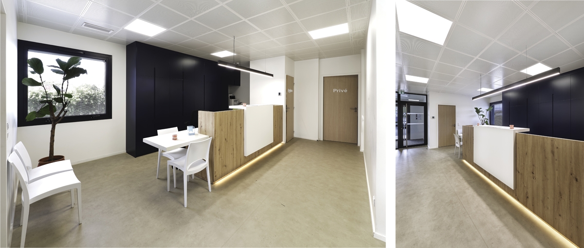 Le rez-de-chaussée de plain-pied, accessible au public d’une surface d’environ 200 m2 comprend la banque d’accueil avec les services, le stockage, la salle d’attente, les bureaux et les cabinets médicaux réunis par des portes vitrées automatiques pour une meilleure hygiène, un atout important dans un lieu dédié à la santé.