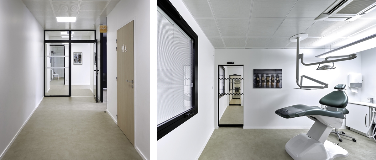 Le corps de bâtiment central à rez-de-chaussée + étage a été conservé et a servi de base à l’organisation du cabinet. Le duo d’orthodontistes a souhaité remplacer les bâtiments annexes et vétustes démolis au rez-de-chaussée pour une extension contemporaine en béton apparent.