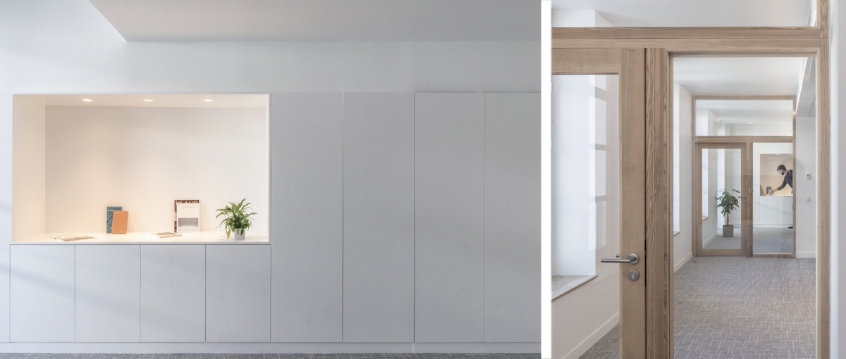 Les bureaux du Conseil Régional de l’Ordre des Architectes et d’Ilot Formation se déploient sur un plateau au 3e étage d’un hôtel particulier toulousain du 19e siècle dans le quartier Saint-Étienne. Le plateau est compris entre la rue, au sud, et une magnifique cour, au nord. Le cadre bâti, à haute valeur patrimoniale et typologique, aux systèmes de composition classique, nous a invité à une insertion juste et mesurée. Un travail sensible sur le second-oeuvre permet de révéler la valeur spatiale du bâtiment à cour en composant avec ses répétitions de baies et systèmes de transparence. Il exploite les qualités de lumière et de ventilation naturelles intrinsèques à la typologie tout en garantissant une diversité d’espaces, de postures et de présences. L’aménagement propose des formes sobres et épurées permettant une appropriation sereine des espaces par les permanents et visiteurs. Il garantit un écosystème d’usages, un continuum spatial et une cohérence à l’ensemble. Aussi, le mobilier est un précieux allié pour définir des identités visuelles, formaliser les usages dans l’espace et ancrer l’âme au lieu. Le projet intègre une réelle démarche économique et écologique grâce à un travail sur le réemploi in situ et ex situ à hauteur de 10% du montant global des travaux (menée avec nos confrères du bureau Tournesol). Il promeut la satisfaction de chaque besoin exprimé ou projeté tout en garantissant la flexibilité et l’évolutivité des cadres de travail et de réception. L’épanouissement des conditions favorables à la réflexion individuelle, à l’intelligence collective des travailleurs et à l’accueil des visiteurs constitue la clé de voûte des modes de composition et de construction du plateau.