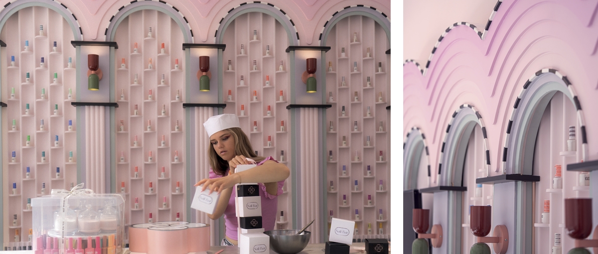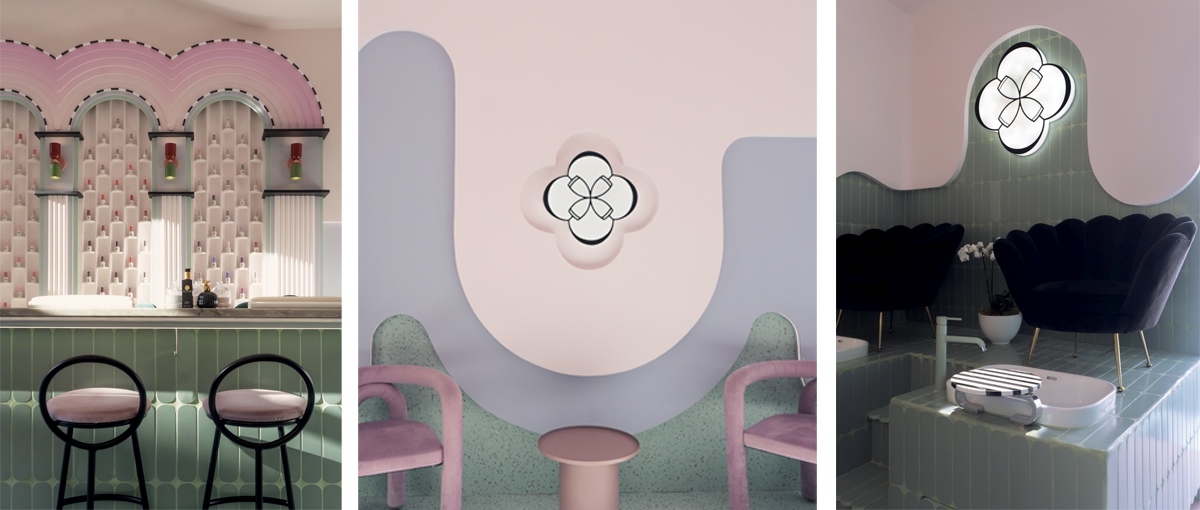 Plus qu’un simple salon d’onglerie, Victoria Baby est un espace à part. Chaque salon plonge les visiteurs dans un thème distinct. Les formes arrondies sont omniprésentes dans tout l’espace. Victoria Baby Lollipop est un bar à ongles conçu pour évoquer un univers crémeux et fondant d’une pâtisserie. Les différentes couches murales se superposent pour donner de la profondeur et une impression de crème coulant du plafond. Les couleurs pastel, cookie, bonbons couvrent les éléments architecturaux. Soigné à chaque détail, le présentoir à vernis est conçu sur mesure pour Victoria Baby Lollipop afin de mettre en valeur une belle palette de vernis à ongles. Le présentoir est composé de 250 coupelles gravées sur mesure, montées sur un fond cannelé donnant de la profondeur. Toute la structure est surmontée d’un fronton constitué de sept couches de différentes nuances de rose. Des bandes LED soulignent et rappellent les arcades toulousaines. Les carreaux de forme ovale évoquent la douceur des biscuits boudoirs et ajoutent une touche mentholée au bar principal et au salon de pédicure.