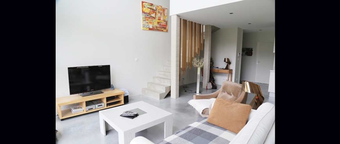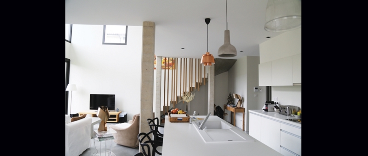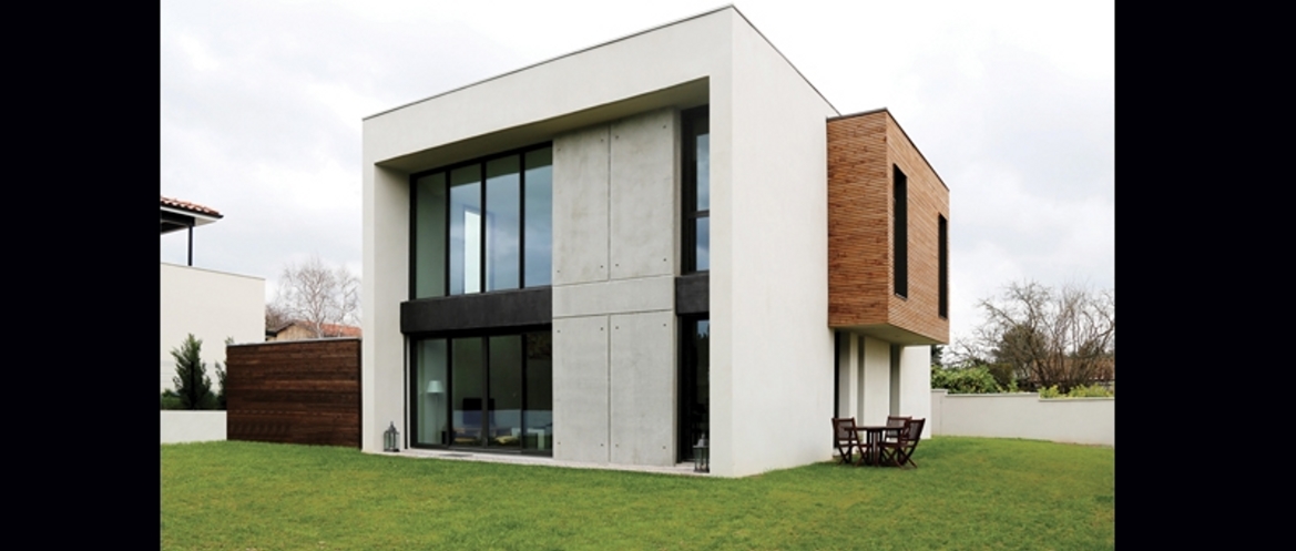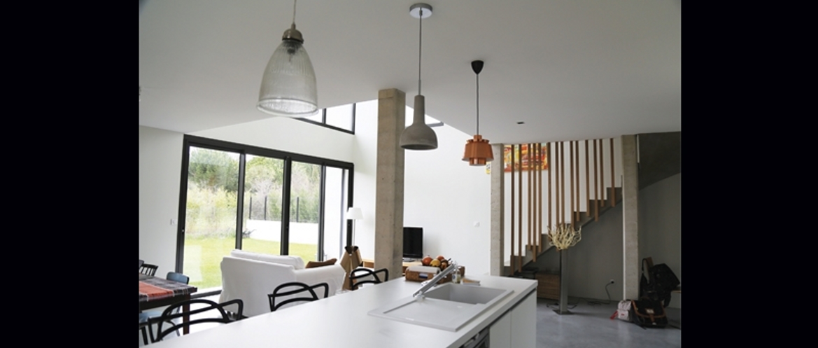 Avec une famille nombreuse, cette maison de 170 m² devait disposer d’au moins 5 chambres et 3 salles d’eau sur un très mauvais terrain nécessitant une forte compacité afin de réduire les coûts des fondations profondes. Les espaces de vie sont orientés plein nord afin de privilégier l’intimité du jardin sur sa partie arrière et d’avoir une luminosité constante au travers de grandes baies vitrées. L’orientation Sud a rapidement été écartée car la cohabitation entre le stationnement des véhicules et le jardin s’avérait impensable. La compacité du bâtiment permet également de participer à cette intimité en offrant des cadrages précis sur le paysage au travers de failles vitrées quelque soit l’endroit où l’on se trouve dans la maison. L’emploi de matériaux naturels comme le bois et le béton était une large volonté tant de la maîtrise d’ouvrage que de la maîtrise d’oeuvre.