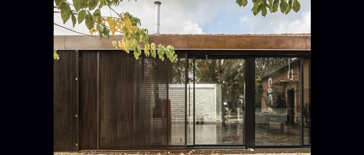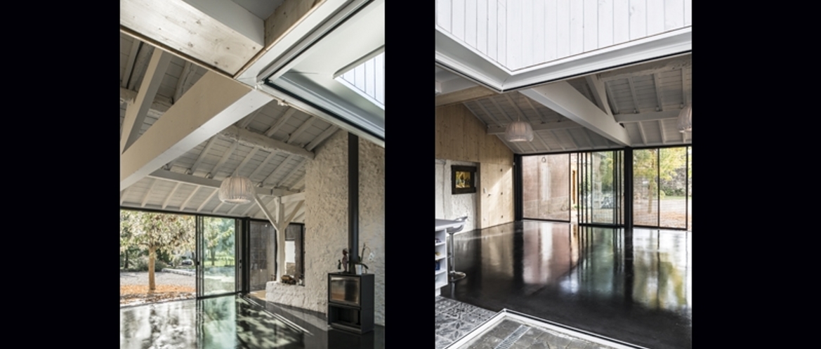 Située à Castillon de Saint Martory, la ferme fait face aux Pyrénées. Le projet porte sur l’aménagement d’une pièce de vie et d’une suite parentale. Le principal enjeu étant de proposer un espace ouvert sur l’extérieur, généreux en volume et en lumière. Sous la grande toiture de tuiles, de lourds travaux d’isolation et de démolition ont permis de retrouver le volume initial de la grange. La façade entièrement vitrée libère la vue vers le jardin et les Pyrénées. Une relation forte entre l’intérieur et l’extérieur est alors valorisée. A l’ouest un patio est créé afin de rendre la pièce traversante et proposer un espace en lien avec la cuisine. Au sud, la dernière travée est dédiée aux parents, on y pénètre de part et d’autre d’une bibliothèque. Au RDC, on y trouve un dressing et une salle de bains ainsi qu’une chambre à l’étage. Le caractère du projet s’affirme par l’expression des matériaux. La pierre est conservée, ainsi que la volige d’origine. Le béton au sol et l’emploi du bois naturel renforce cet aspect brut des matériaux. Pour autant le projet ne se veut pas rustique, mais résolument contemporain. Les panneaux coulissants en caillebotis poursuivent ce travail sur la lumière en créant une ambiance intérieure par les reflets et les ombres qu’elle produit sur le sol et un confort thermique important. Ces panneaux permettent aussi de refermer entièrement la façade lorsque la maison est inhabitée.