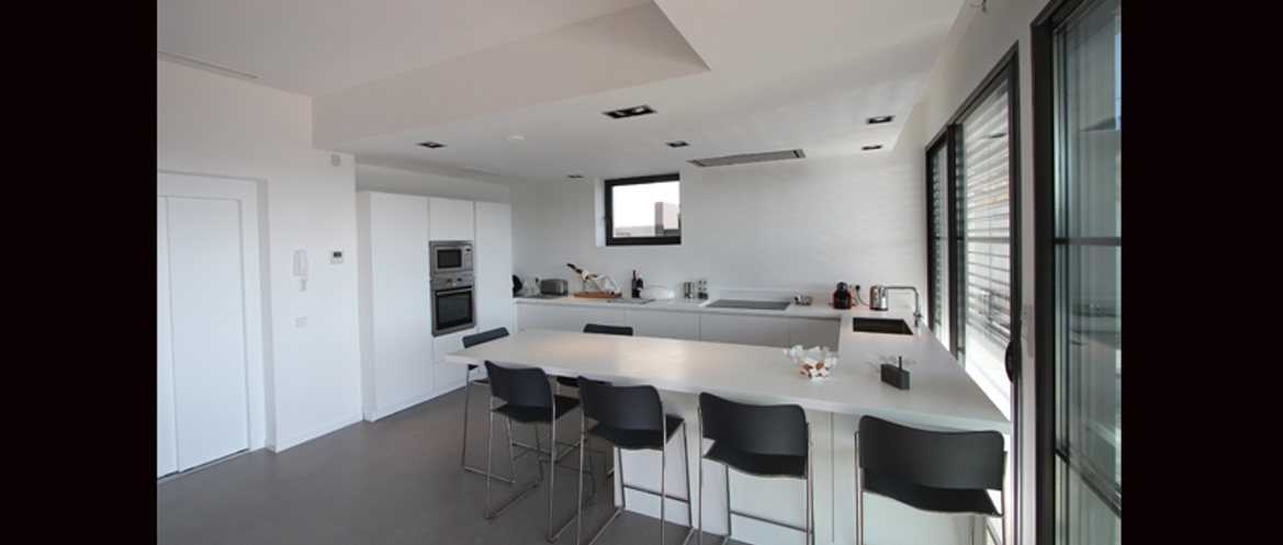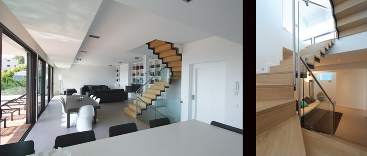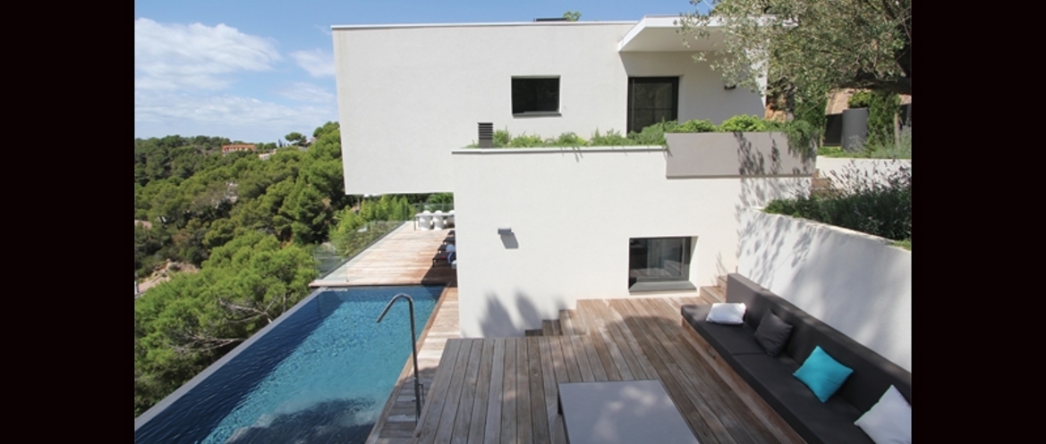 Pour cette réalisation, une résidence secondaire située sur le côte rocheuse de la Costa Brava, l’architecte a choisi d’articuler la villa en l’organisant sur 3 plateaux. Un premier niveau comprend l’entrée ; le garage et la suite parentale. Le niveau intermédiaire réunit la cuisine, le coin repas, le séjour avec la cheminée, la terrasse avec piscine à déversoir avec vue sur la mer. Le dernier niveau, quant à lui dessert un salon éclairé par le hublot de la piscine et 3 chambres avec un panorama de toute beauté. L’architecture se veut minimaliste, avec porte-à-faux destiné à protéger du soleil la grande terrasse du niveau jour. Contrairement à toutes les constructions voisines sur terrains à forte pente, la piscine, toujours prévue en aval, a été remontée au niveau intermédiaire pour être de plain-pied avec la zone jour.
