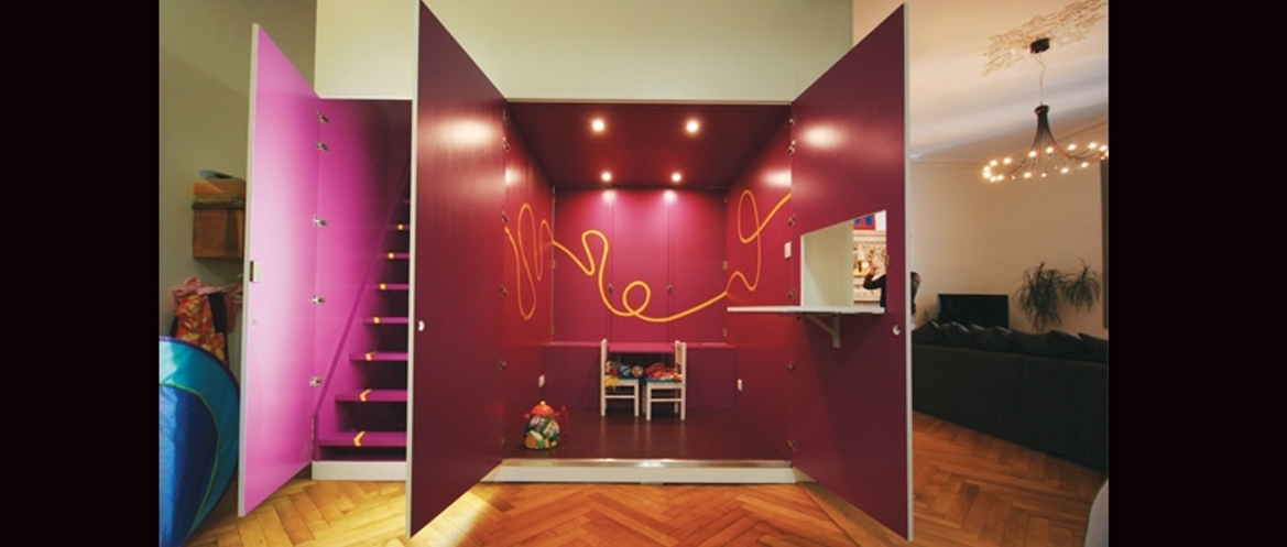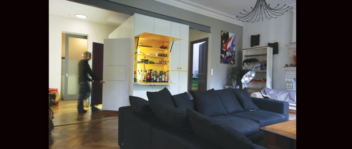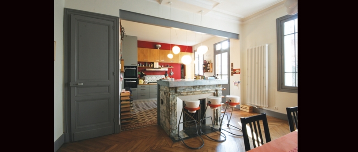 Avec ces belles hauteurs sous plafonds, ses parquets et menuiseries travaillés, son jardin préservé, cette maison bourgeoise proche du canal à Toulouse cache bien son jeu depuis la rue. L’essentiel est là, des interventions ponctuelles vont permettre de mettre en valeur ses qualités. Le mariage entre ces touches contemporaines et l’existant ancien restauré rendent ce lieu unique. La cuisine est ouverte, la cheminée en marbre conservée et habillée d’un plateau de zinc fait office de bar et d’îlot central atypique. Un grand monolithe blanc prend place dans le séjour et redéfinit les espaces, entrée d’un côté, salle de jeux de l’autre. Ludique, coloré à l’intérieur, il abrite plusieurs fonctions : rangements d’entrée, espace bar, cabane pour les enfants, lit d’appoint au-dessus. Une salle d’eau est également entièrement rénovée. Une nappe en résine blanche constitue la vasque, la douche et la baignoire. Un brise-vue en bois permet de disposer les bibelots et les produits de beauté. Le pavillon attenant était un appartement très ancien, et méritait une rénovation en profondeur. Certaines cloisons ont été ouvertes, tout comme le plancher des combles qui a été entièrement déposé pour retrouver le volume sous pente. Les espaces ont ensuite été redistribués, pour créer un appartement en duplex, baigné de lumière. Les chambres profitent désormais d’un espace en mezzanine, qui double presque leur surface, accessible par des escaliers qui semblent flotter…