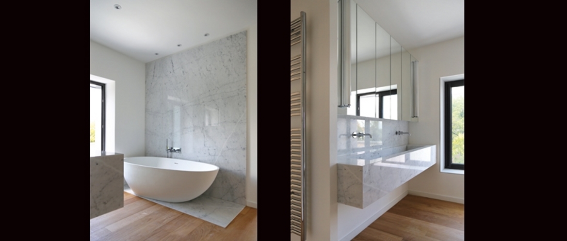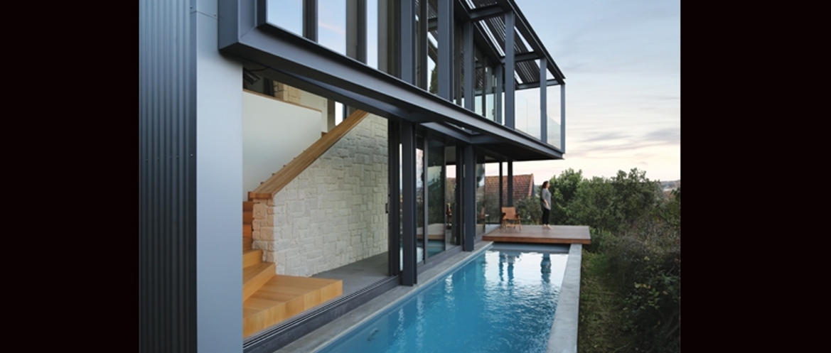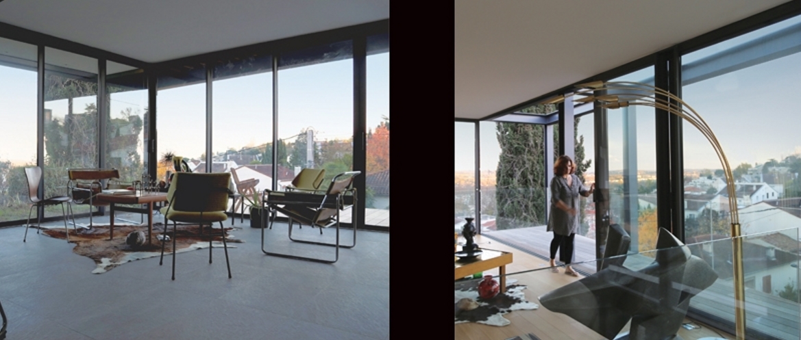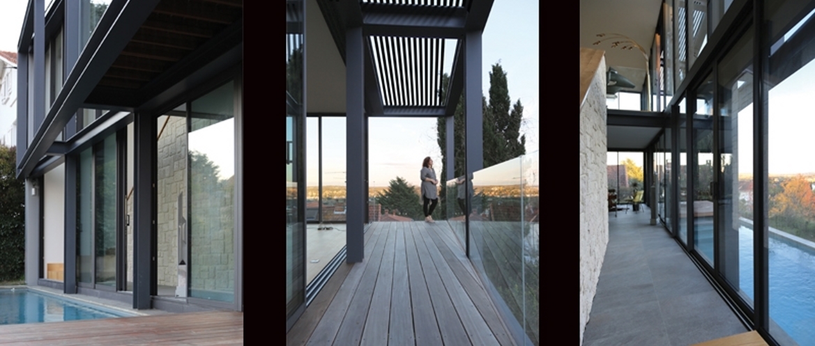 Il s’agit d’une réhabilitation complète d’une maison de ville des années 60 perchée sur la côte pavée à Toulouse. Au départ nous devions seulement reprendre la maison en ajoutant une extension sur l’arrière mais très vite le parti d’organiser et de fédérer la maison sur la vue fut essentiel. Nous avons donc ouvert complètement la maison sur le paysage, ajoutant un volume surplombant la pente, encore une terrasse-balcon et une piscine. L’escalier extérieur fut enveloppé par la façade vitrée et devint l’escalier de la maison. Au fil des marches, la vue incroyable se dévoile pour progressivement nous accompagner au salon de l’étage véritable belvédère sur le Lauragais. L‘isolation extérieure bardée de tôle ondulée assure une bonne stabilité thermique par inertie des masses thermiques intérieures. Le mur de l’escalier ancien devant les baies agit ainsi comme un mur trombe autochauffant. Manque aujourd’hui les brise-soleil verticaux en structure métallique sur la façade sud, pour permettre le bon réglage de ces apports solaires passifs, prévus pour les beaux jours…