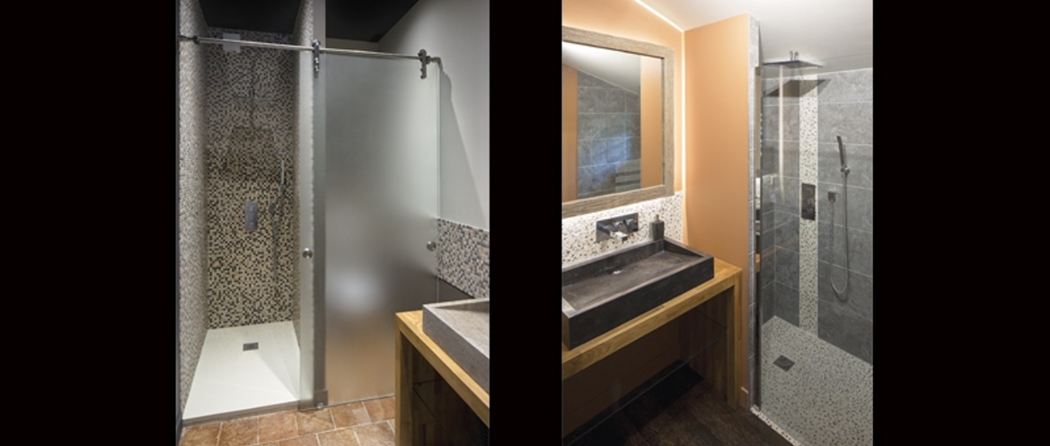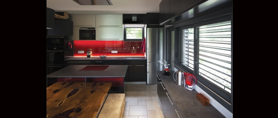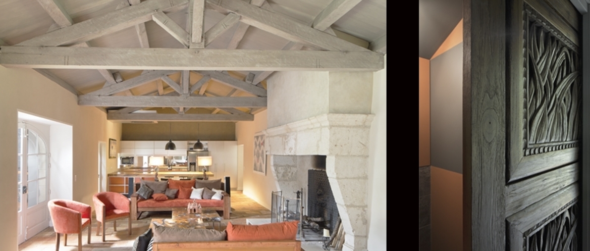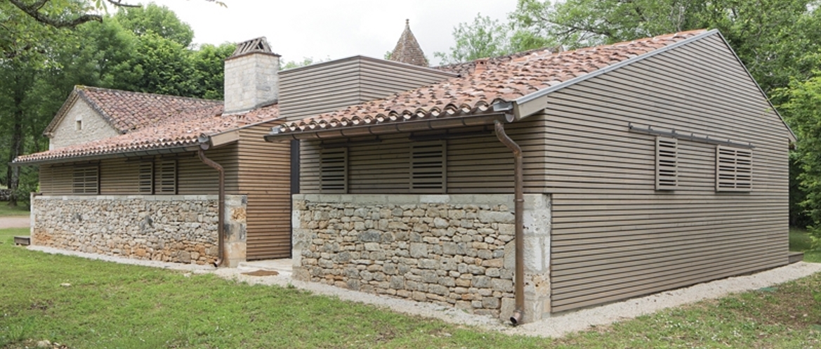 Cette belle bâtisse typiquement lotoise, est située dans le sud du département du Lot ; elle est composée de l’ancienne maison du 18e siècle avec pigeonnier et d’une grange aménagée au milieu d’une propriété de 8 hectares avec parc, bois et prairies. Sur l’ancienne habitation avec son « bolet », entièrement réhabilitée, est venu se greffer un volume cubique surélevé en bois et bardage mélèze, accueillant la nouvelle cuisine, très vitrée sur l’extérieur avec des volets bois coulissants et des stores à lames pour assurer la protection solaire et le dosage de la lumière. L’ancienne grange, également réhabilitée en vaste pièce à vivre familiale et sa cuisine, est prolongée par une extension accueillant 2 chambres, avec chacune salle de bains et terrasse ; cette extension est composée de murets en pierre sèche du Lot, de murs à ossature bois bardés de lames de mélèze ajourées et d’une couverture en tuiles dans le prolongement de la toiture existante. Au total l’ensemble développe une surface de plus de 400 m2 habitables, auquels se greffent de nombreux espaces annexes : ancienne cave voûtée réaménagée, four à pain, cave à vins … La décoration intérieure très élégante met parfaitement en valeur les volumes aussi bien existants que neufs, avec une association de matériaux ramenés d’Asie par les propriétaires et intégrés au projet dés la conception : portes bois sculptées, carreaux de faïences, parquets, meubles.