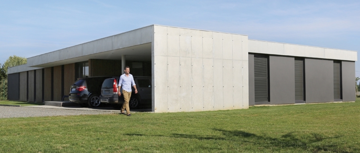 La toiture béton lourde est portée par une ossature bois. Quelques voiles béton organisent les partitions et les contreventements.