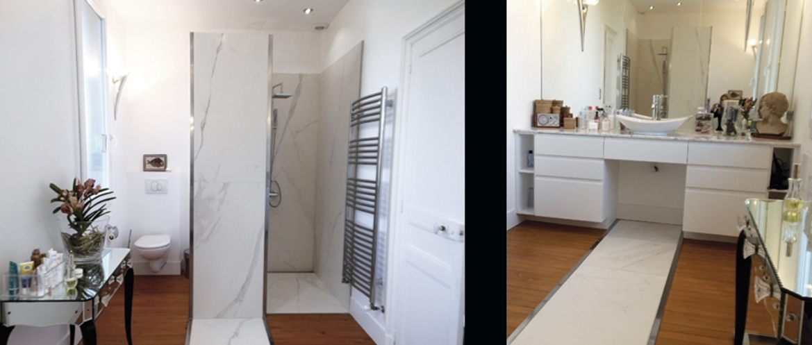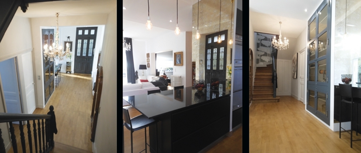 Cette maison des années 30 a été restructurée au rez-de-chaussée et l’étage pour moderniser les pièces dites techniques à savoir principalement la salle de bains et la cuisine. Dans cette maison « classiquement » coupée par un couloir distribuant des pièces de vie ; il y avait un manque évident de luminosité. J’ai donc cherché à redonner de la lumière et j’ai dû reconfigurer les espaces de vie en ouvrant sur une grande pièce à vivre en bas et en regroupant certaines petites pièces en haut. La cuisine devait se moderniser mais aussi, s’accorder avec l’esprit très « déco » existant. La propriétaire, collectionneuse dans l’âme, avait un certain goût pour l’hétéroclisme et l’inédit. C‘était parfait ; restait donc à organiser ce lieu, et lui restituer son supplément d’âme ! Le principal enjeu (comme souvent), après la disparition de certains murs, fut de trouver une nouvelle place aux besoins de rangements, d’unifier les sols, prolonger à l’identique les parquets d’époque, re coloriser l’ensemble de la maison, techniquement d’évacuer la nouvelle douche etc… et surtout d’intervenir dans un univers déjà typé, donc de conjuguer le passé et le présent de façon harmonieuse…