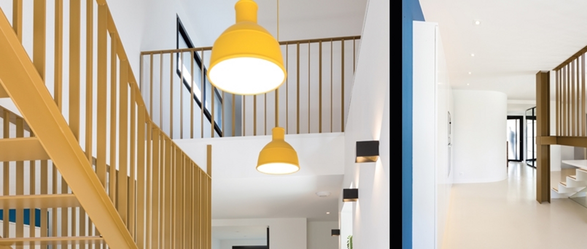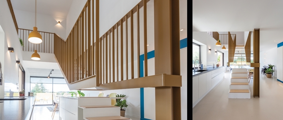 Cette maison se caractérise par le contraste des volumes, des lignes épurées et des formes minimalistes. Elle se compose de différents « blocs » qui, par leur disposition leur étage et leur articulation permettent une perception et une lecture extérieure des espaces intérieurs. La conception étant faite dans un seul matériau, le contraste entre les volumes est renforcé par une utilisation de couleurs différentes qui accentue la présence de la boîte en hauteur. L’architecture intérieure est focalisée sur l’espace, la luminosité et l’ouverture sur le jardin. A certains endroits comme dans le salon, il y a eu un choix d’opposition de matériaux. Le plafond est laissé en béton brut tranchant avec l’utilisation habituelle des plafonds en placoplâtre. Cette approche architecturale permet de valoriser une utilisation originale de certains matériaux de construction et renforce le caractère moderne de la maison. Un escalier totalement suspendu, passant au dessus du plan de cuisine invite vers l’étage de la partie nuit. Sa réalisation a été pensée dans le désir de légèreté d’un élément ne reposant pas sur un support. En harmonie avec l’environnement qu’elle rehausse par un contraste franc cette maison sait également tirer profit d’un panorama sur la campagne environnante. Jardin, terrasses, piscine, parties en porte-à-faux, jeu d’espaces extérieurs couverts et découverts permettent une vie de famille qui se déroule avec facilité.