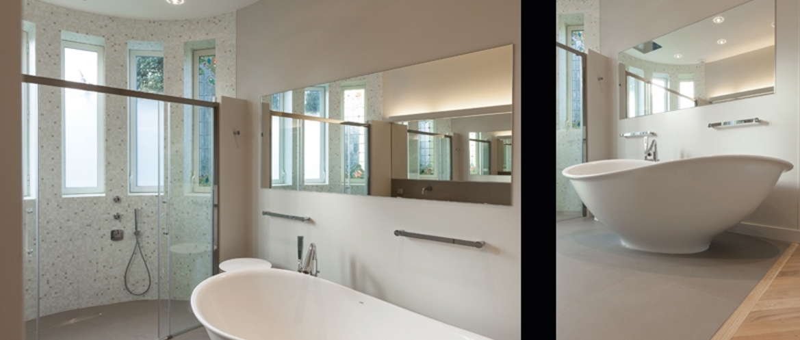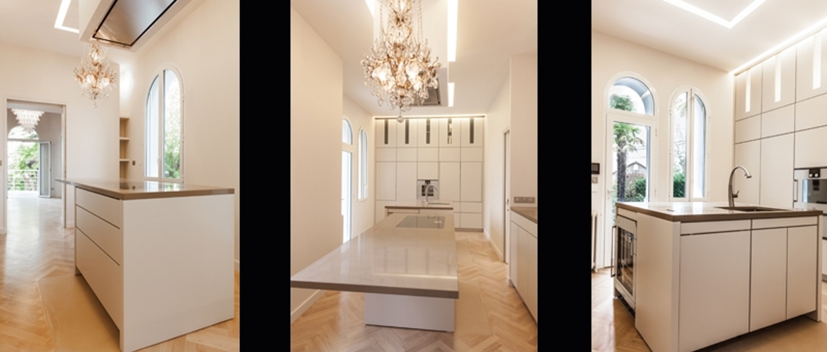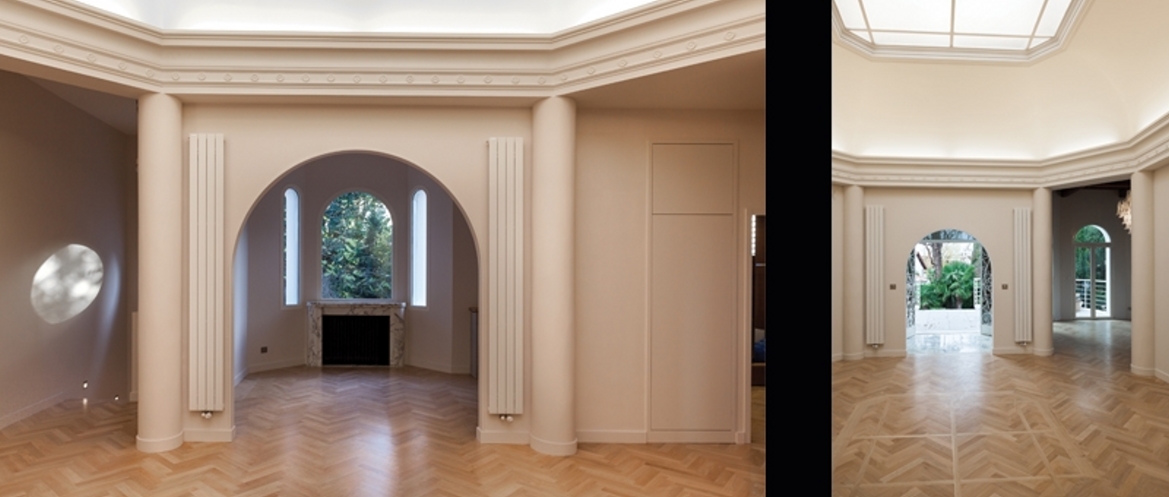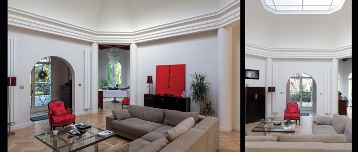 Une Folie se caractérise par des excentricités formelles et un certain lyrisme des volumes. Ici, les salons de réception sont de forme octogonale. Le principal, central, est coiffé d’une coupole percée en son centre par une large verrière, sertie d’une corniche travaillée et portée par huit colonnes. L’entrée présente une facture orientale qui sera conservée. Les principaux objectifs ont été la rénovation complète de la villa, d’y apporter un langage plus contemporain, d’amener davantage de lumière, d’harmoniser et de lier les espaces entre eux, d’agrandir la cuisine et la suite parentale, de valoriser le niveau bas très peu investi. De larges ouvertures ont été créées entre les salons de réception, dessinant des perspectives intérieures et aussi des vues cadrées vers l’extérieur. Les accès entre les espaces satellites et le volume central ont été largement ouverts jusque sous corniche et entre poteaux, servant ainsi l’échelle monumentale du salon principal et liant davantage les espaces entre eux. L’apport accru de lumière se fait par des tons chauds et clairs sur les parois et par le clair de jour augmenté. Sur sa totalité, le sol reçoit la pose d’un parquet en chêne massif ce qui harmonise et lie visuellement les deux niveaux. L’éclairage intérieur est principalement indirect à l’exception d’un lustre en verre de Murano, suspendu dans la salle à manger et d’un lustre en cristal d’époque. Ces deux objets, uniques et très présents dans l’espace, participent pleinement au lyrisme du lieu.