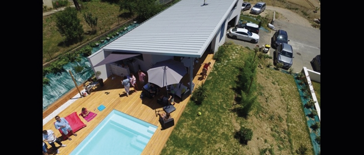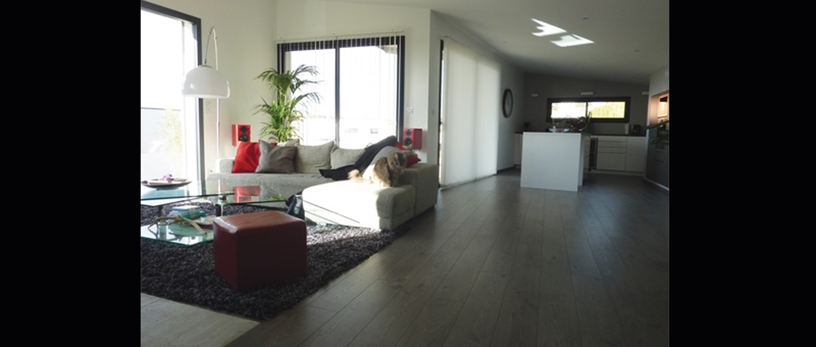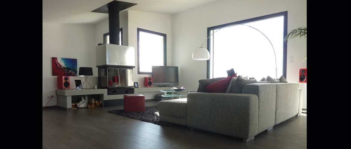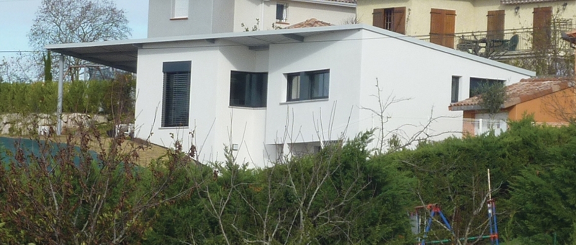 Bâtie sur un terrain en pente avec une densité élevée d’habitations souvent inadaptées au contexte ; la maison propose une réflexion sur l’articulation des espaces privés et publics en lotissement de banlieue. La situation laissait présager de futurs vis à vis, mais aussi une possible vue dégagée au sud à prendre en compte dans le concept. Le volume étroit et long permet de minimiser les décaissements liés à la forte pente mais aussi une distribution des pièces favorisant les meilleures orientations et vues. Un jardin plat s’établit au niveau des pièces de jour. L’ensemble est couvert par une toiture monopente en bac acier.